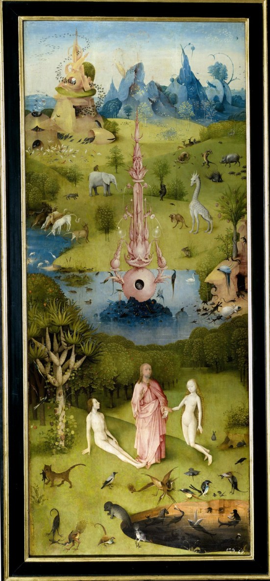 On the left panel, we find a verdant and tranquil landscape populated with all manner of beasts and birds. Twisted hills extend across the background while a light coral fountain redolent of equipment in an alchemy lab dominates the middle ground (see “Alchemy at work in the garden” in Times Higher Education by Professor Laurinda Dixon of Syracuse University, NY). The main action here is concentrated in the foreground, wherein the Creator God, anthropomorphised in a younger guise, presents Adam with Eve (Genesis 2:20-25).