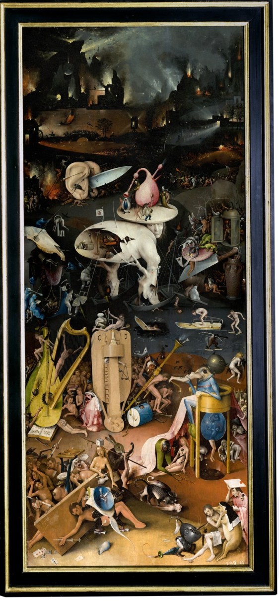 The final right panel of the triptych depicts a hellscape – an arena of damnation. Far away, a prison-like city with high walls is set on fire, before which humans are subjected to all sorts of torments at the hands of strange figures. They appear devoid of that erotic confidence and are, instead, wracked with a sense of shame. There is ingestion, excretion, ejection. Some climbing and drowning. People are punished for and purged of their sins. Musical instruments lie defunct and a pair of giant human ears is pierced with a large and sharp knife – allusions to the deceptive and dooming aspect of sensory appeal. The focal point of this hellscape is a pale white human face with a body that is part broken shell, part tree (which the German art historian Hans Belting has called a self-portrait of Bosch). A round pink bagpipe on his head is reminiscent of phallic symbols and is possibly an admonition against uncontrolled lust.
