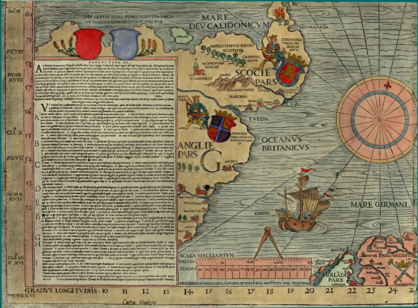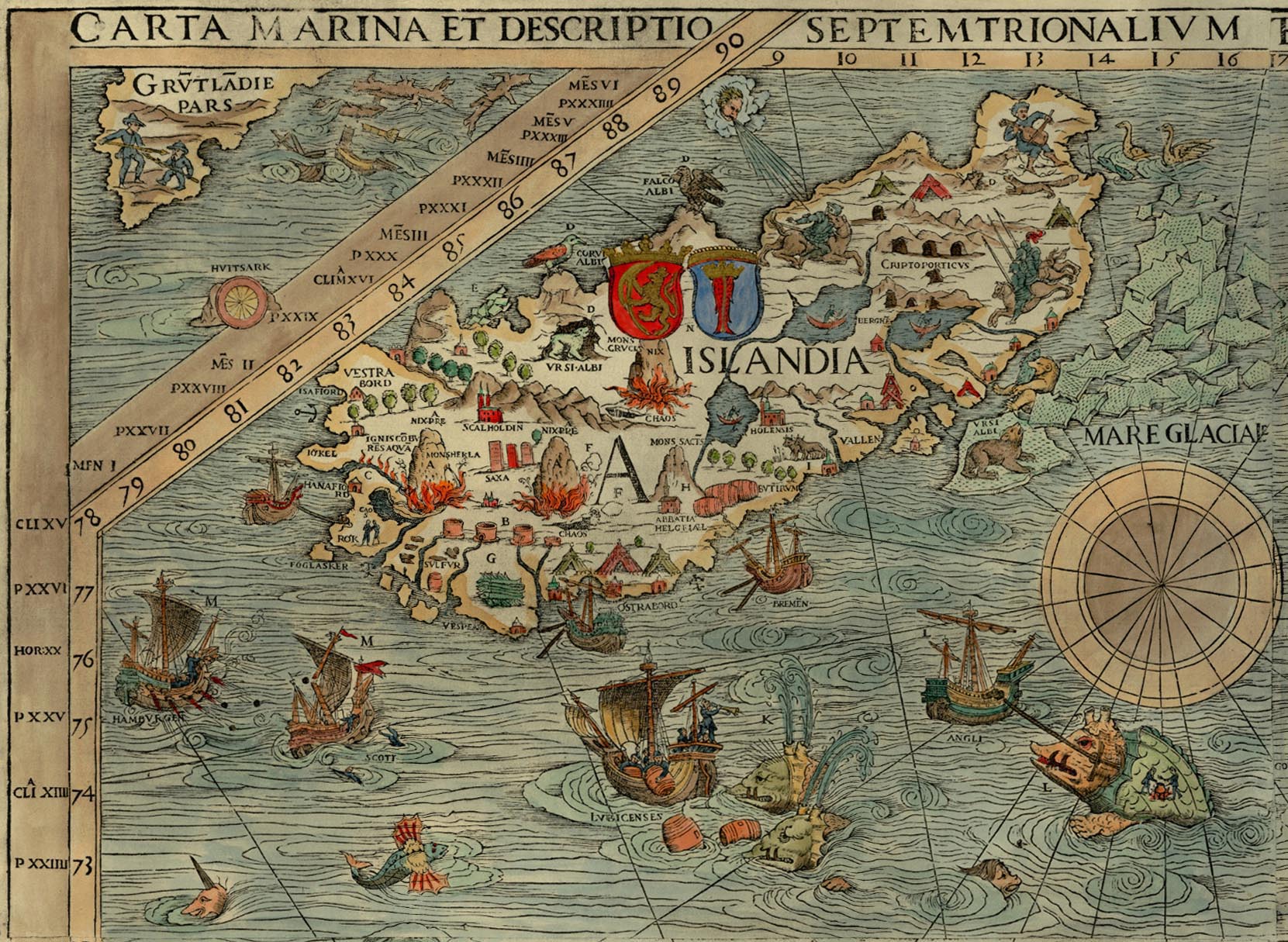 The Carta Marina was made at the beginning of the Age of Discovery (or Age of Exploration), when a residual belief in fantastic beings such as unicorns and hybrid human-animal races, still persisted in the European imagination. As a result, the map teems with imaginary characters. But that is not all. It also shows a “variety of marine activities, commercial traffic, fishing, the measuring of water depth and boats in distress” (T. Rossby, Graduate School of Oceanography, University of Rhode Island), which is unusual for the time.
