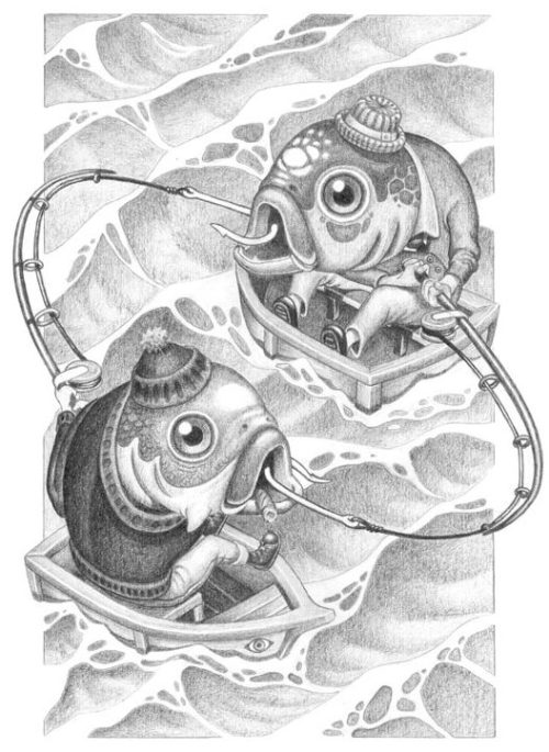 “With this image,” says Michael, “I was trying to depict the transcending of duality. People have been hunting and eating fish for a very long time and that has shaped the evolution and behaviour of fish. Likewise, when one eats a fish, they are changed chemically and physically. Since both humans and fish help to shape each other, it could be said that people and fish are really the one entity. The idea that we are separate from fish is only that. An idea. Depicting the fish-animal hybrids helps blur the boundaries of the relationship. I am using the relationship between fish and fishermen to describe a greater concept. A relationship between opposites is an entity in itself.”