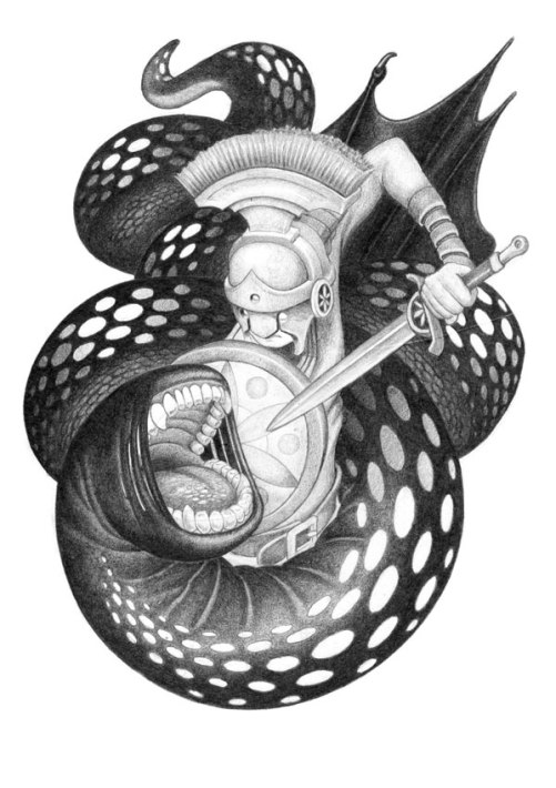 St. George (AD 275–281 to AD 303) was a soldier in the army of the Roman emperor Diocletian. A Christian martyr and patron of several countries, cities and occupations, he is most famous for the legend of the dragon. Michael says: “It’s a classic hero myth. In this drawing the dragon represents my hunger. That’s why the dragon is all mouth and tentacle. I was trying to inspire myself to overcome my hungers and control them. It didn’t really work. I was a bit foolish. For a long time I have tried to beat my hungers into submission. I had some success, but ultimately my hungers won out. Perhaps I will do a follow up to this drawing where St George is having a cordial, peaceful and cooperative relationship with the dragon.”