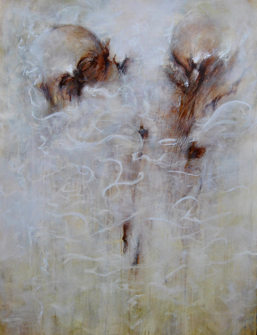 Many of Axelle’s works are raw and formless and foggy, even frightening. “Trauma wreaks havoc in the soul and in the body,” she says. “It takes residency and attaches itself to the nerves, muscles and settles deeply into the brain and skin.” She has herself, she confesses, lived through a state of mental and physical exhaustion: “The confusion of feelings isolated me from the world. My thoughts were impaired and I found it impossible to express myself. Studies show that during a traumatic event, the brain skips verbal communication and leaves one with no voice to reach the outside world. As an artist, I’m working on how to show the alteration that an identity goes through after trauma. How to represent it? How to paint it? I find myself working more and more on self portraits. While they are not photographic representations, these self-portraits are expressions of my inner-self and experiences. Layer after layer, a fragmented identity surfaces on the canvas. The colour palette of my paintings have drastically from dark tones to lighter, earthier ones, especially since my move to the US. The change is noticeable. Now, often, white invades the canvas, white as grief, white as a blank page, white as a new beginning.”