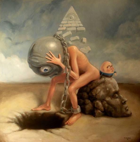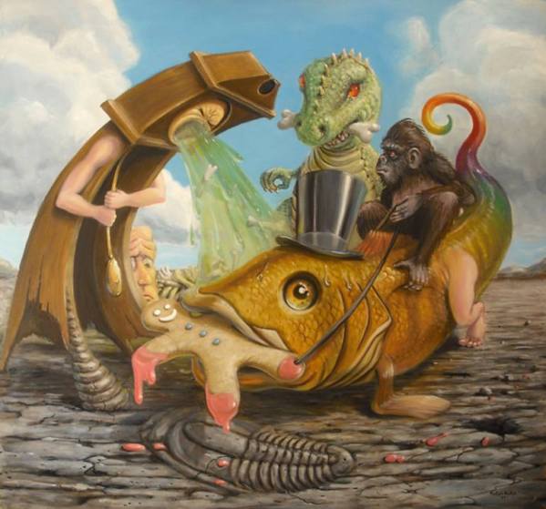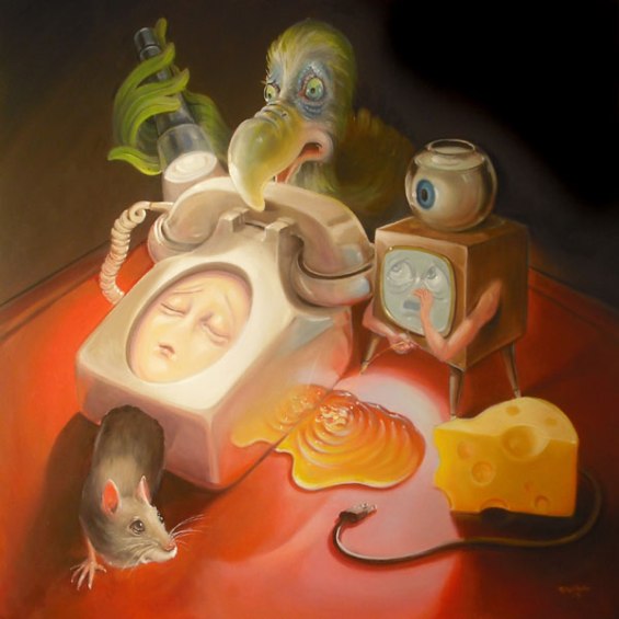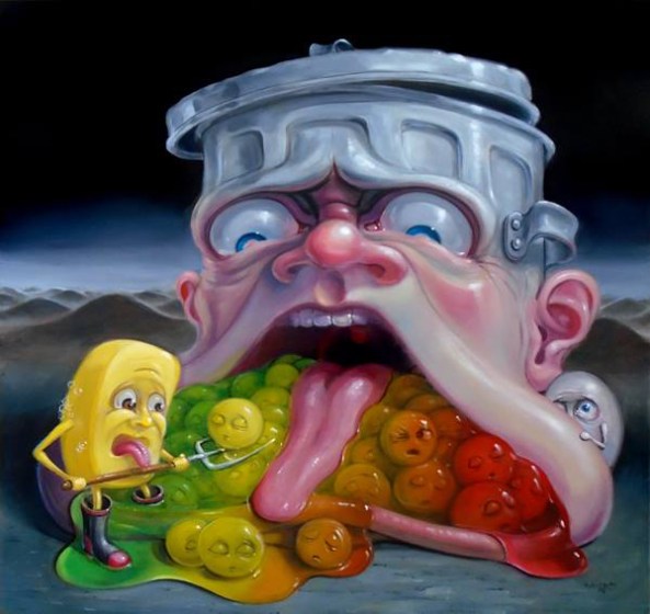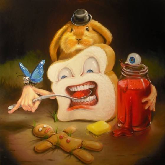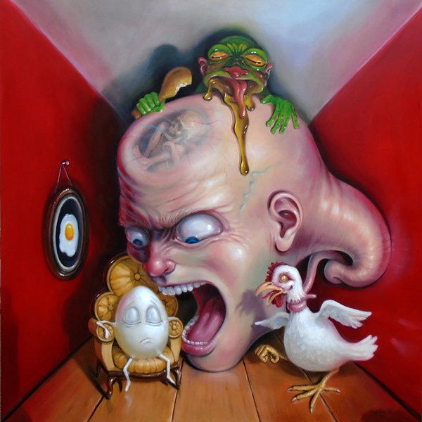 It all started when he was 11. The moment Stephen Gibb (of Windsor, Ontario, Canada) discovered the wicked and whimsical paintings of the Early Netherlandish artist Hieronymus Bosch (c. 1450-1516), he knew that he was going to be an artist. As he grew up, he was both fascinated and repulsed by the gruesome characters popularized by the American cartoonist Big Daddy Roth. Commercial icons like Aunt Jemima and the Quaker Oats guy, nursery rhyme illustrations of Humpty Dumpty, moon faces and any cartoonish character displaying an extreme emotion also made quite an impression on Stephen’s mind. And now he creates paintings in which clocks puke, eggs sleep and faceless eyeballs run hither and thither. “Everyone is quick to lump me with surrealism and specifically with Salvador Dali,” says Stephen, “but I think I have more to do with Mad Magazine than with Sigmund Freud. I prefer to think of my paintings as editorial cartoons for contemporary culture, or maybe cautionary fairy tales for adults. Greeting the viewer with an element of up-front humour, yet inviting them in for further analysis, since beneath the cartoonish appearance and characters lies a deeper, darker message waiting to be unravelled.”