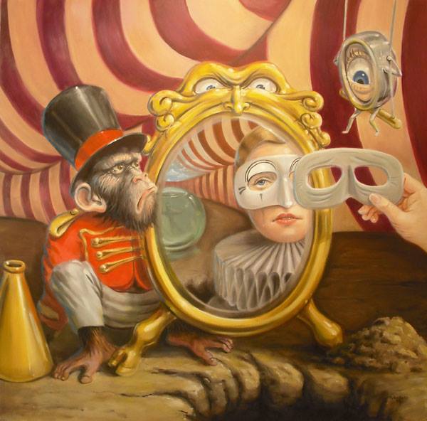 So it is not so much pop-surrealism as “existential editorial cartoon realism” – Stephen has tagged his work thus because that way it sounds more intelligent, pretentious and funny at the same time. The body of paintings weaves an eclectic tapestry of cultural and social influences. At one moment it may make a single-punch-line commentary on pop culture, while the next it may construct a complex and playful diorama probing into the outer perimeters of human nature.