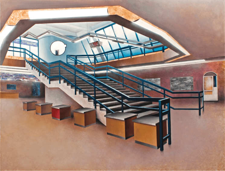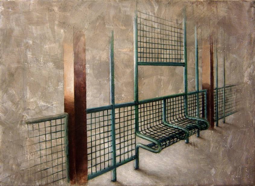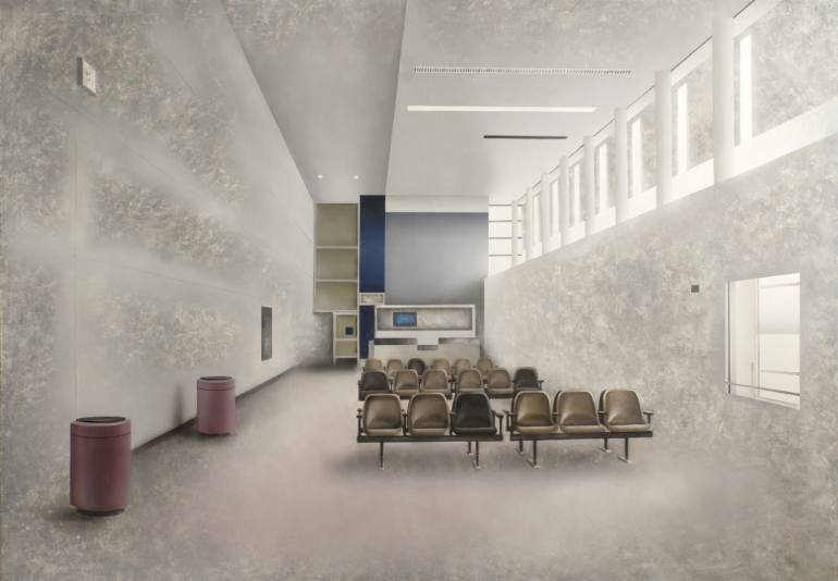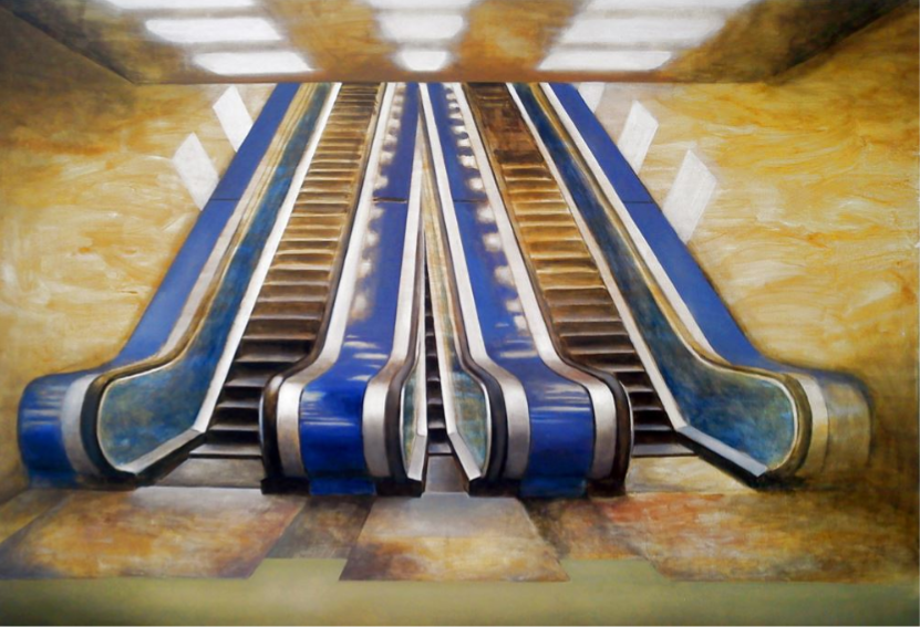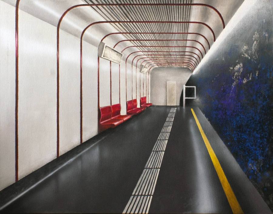 As soon as we are able to pick up our first pencil or crayon, we are told to draw land- or seascapes that are complete and detailed and well-composed. The sceneries of our dreams – to which would love to travel, and live. And a lot of art is dedicated to just that – but not the work of the Marek Jarotta (born 1988), based in Ružomberok, Slovakia. A graduate of the Academy of Fine Arts and Design in Bratislava, Marek enjoys capturing “non-places” in his paintings and sketches. These are areas that lie between destinations. Escalators, elevators, queue lines before counters, metro tunnels, lounges at air terminals, platforms at railway stations – we may not pay much attention to them but together they make up an inescapable and undeniable part of our everyday life. “People are constantly moving from place to place for different reasons,” says Marek, “they commute or migrate in search of employment or in pursuit of pleasure. The world is very dynamic.”