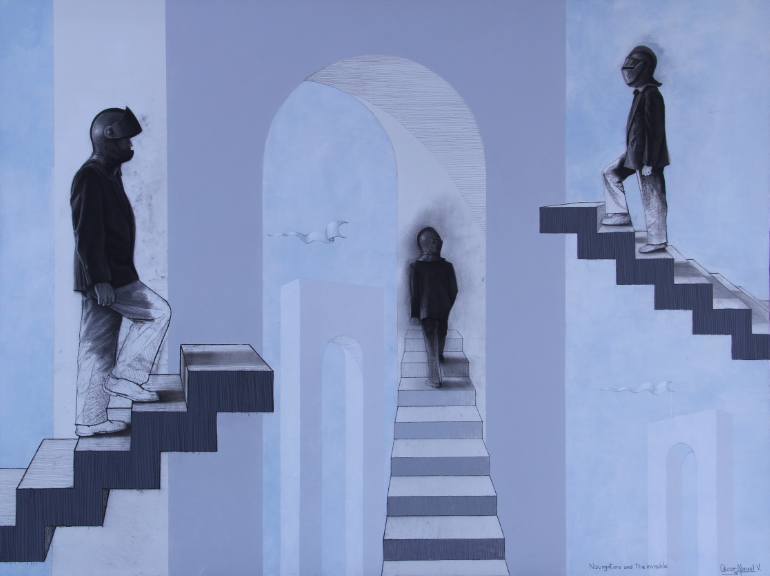 Oscar’s art is a kind of metaphysical travelogue. Full of portals and staircases, arches and pillars, tiled platforms and mysterious dark spaces around and within which navigators walk, sail and fly to and fro. Sometimes a little confused yet always determined to solve the puzzles of existence.