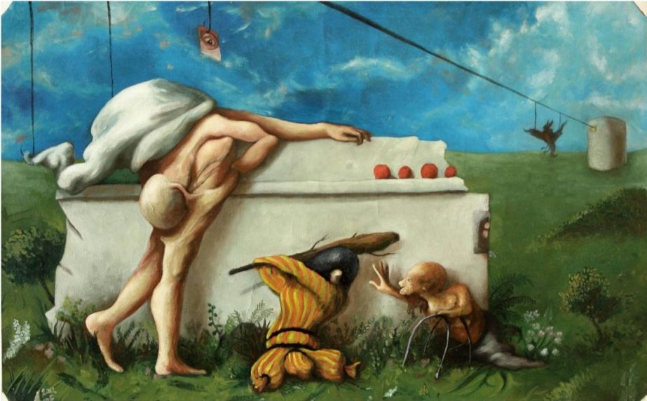 São Paulo-based artist Marcos Tedeschi (born 1982) calls himself “a painter with psychological problems, producer of some subaltern art”. His work is raw and disturbing, an unabashed catalogue of ugliness. Deformed or incomplete pieces of human flesh are visible throughout – usually in situations of torture and chaos and disillusionment. Marcos says that his recurrent themes are “loneliness, medicine, pornography, religion and the individual human attitude facing situations of rejection/acceptance”. His art is not a search for truth or understanding. It just seeks a way of rationalising existential confusion. He hopes to expose individuals to the fact that they are perishable and no agent – mode of knowledge or activity – however promising, can cure or overcome this simple and harsh reality.