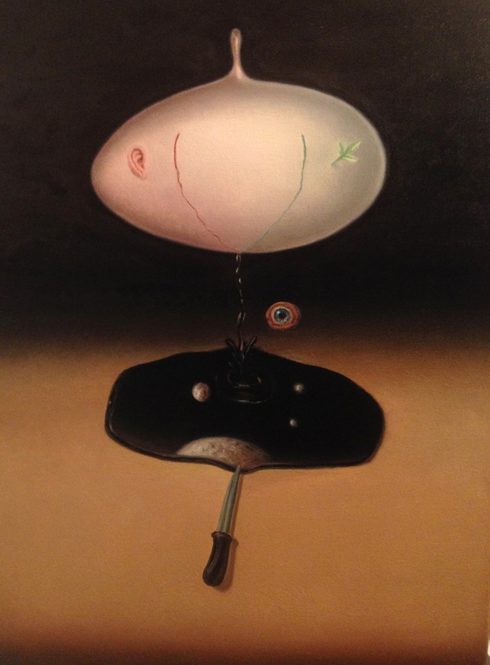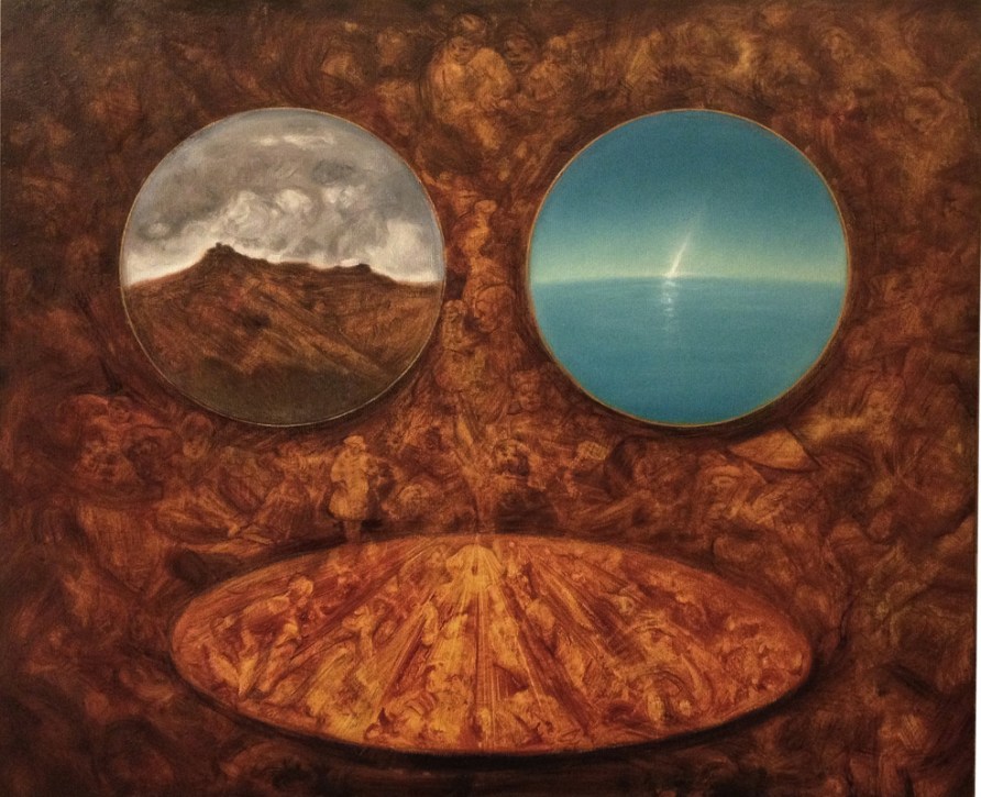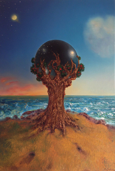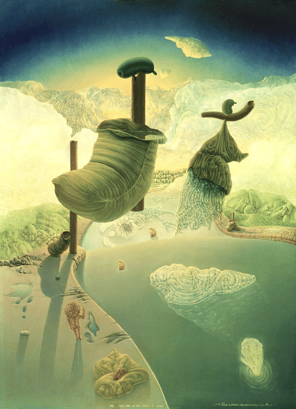 Themes of vision and consciousness are easily present in his paintings. The landscapes created give the impression of being the surfaces of alien planets or they look like microscopic magnifications of our very own biological realities. Frequently, grand cosmic vistas point to the possibility of metaphysical truth.