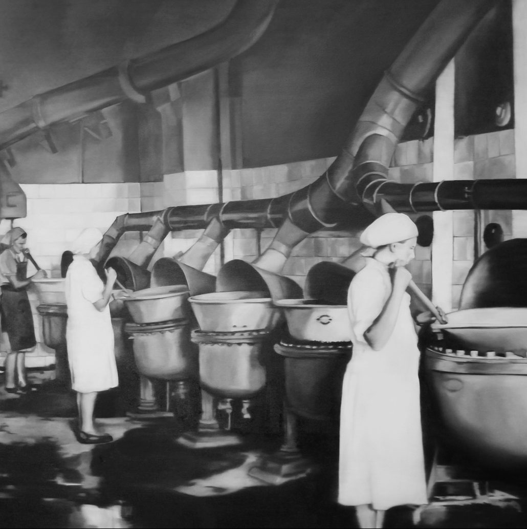 As of now, her portfolio is mainly divided into three parts – “Factory” Series, “Product Series” and “Atomic Landscapes”. We find women labouring away in food and garment factories, consumer items like chewing gums and brandy bottles and comic books and toys, a definite preoccupation with nuclear power. Even frolicsome moments from everyday life. Though everything is contained within a limited and specific temporal and geographical framework, there is a grand, epic quality to the scenes. On her creative process, Martina says, “I use a lot of photographs. Some I make myself – like in the Product series. But mostly I use whatever I can find in old books, albums, archives, Google or archive movies and documentaries. It takes a really great amount of my time and I enjoy it. I use photography or photo montage as a reference and try to upgrade it with my imagination.”