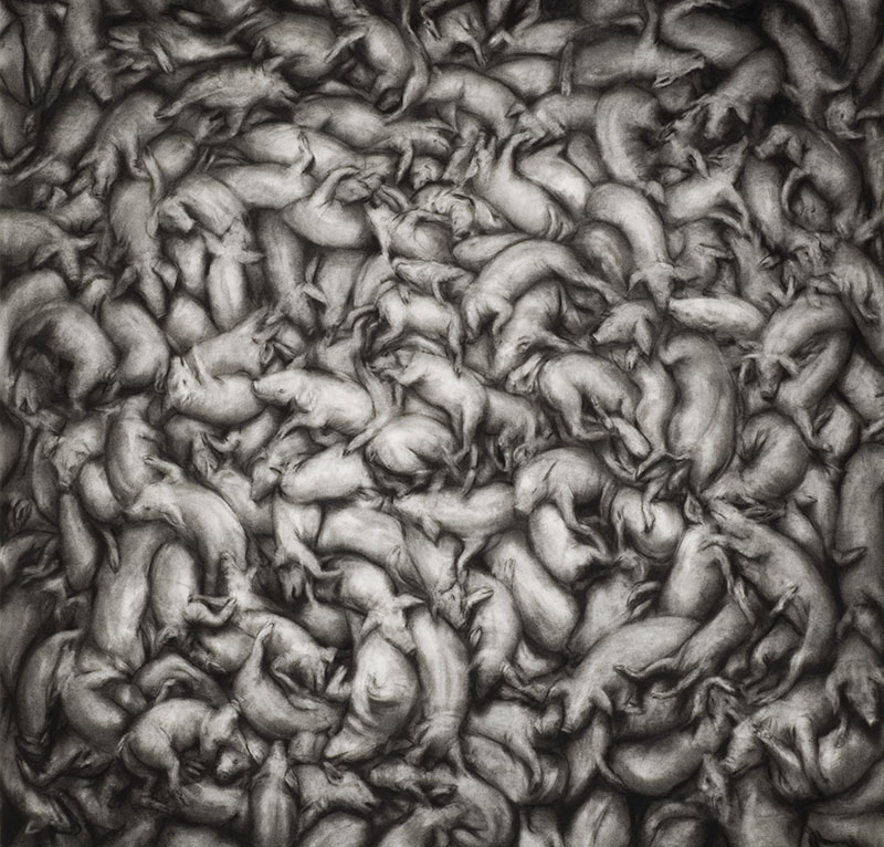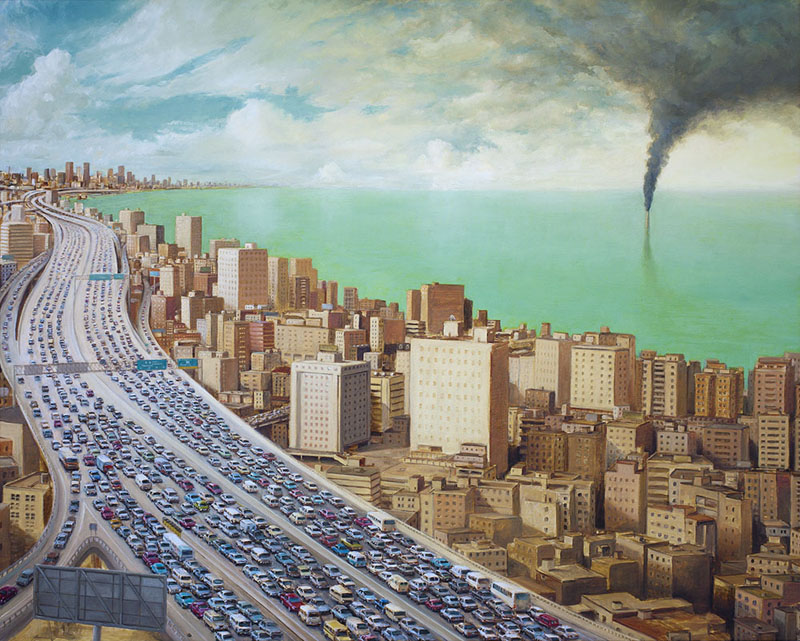 “A lot of stories that are written about me tend to play up the gloom and doom aspect of my work,” says San Francisco-based artist Michael Kerbow, who holds an MFA from Pratt Institute in New York. There is, undoubtedly, something dark and portentous about his drawings and paintings – unusually large clusters of cars and pigs, complex grids and curves of highways. Skyscraper after skyscraper after skyscraper with no sign of greenery. The packed and suffocating urban landscape has been probably designed and constructed by humankind and yet individual men and women are strangely absent from these scenes. Who runs and rules over the cities? We don’t know. Everything might as well have been orchestrated by some kind of highly evolved and sophisticated artificial intelligence.