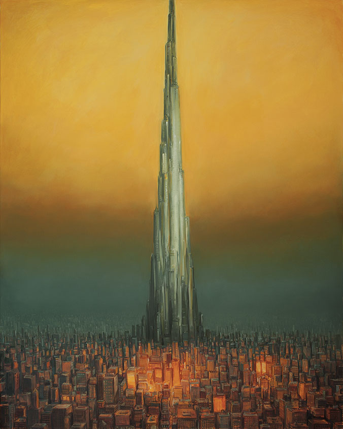 Michael’s artworks may seem to be, in a way, depictions of our ultimate demise – but they may also be read and interpreted as portraits of our ambitions, our ever-active intellect. Michael believes that “the human imagination can find humour and beauty in the most extreme situations.” A positive energy can, at times, be found in the movement and geometry of these otherwise “dystopian” scenes.
