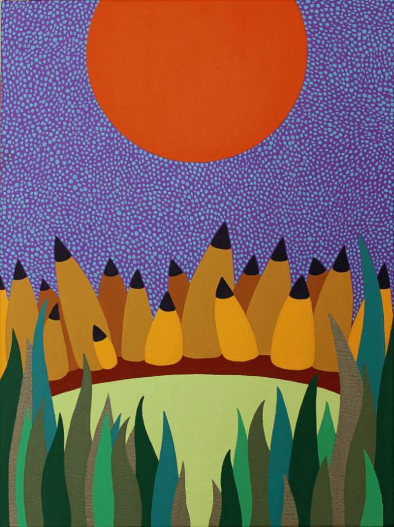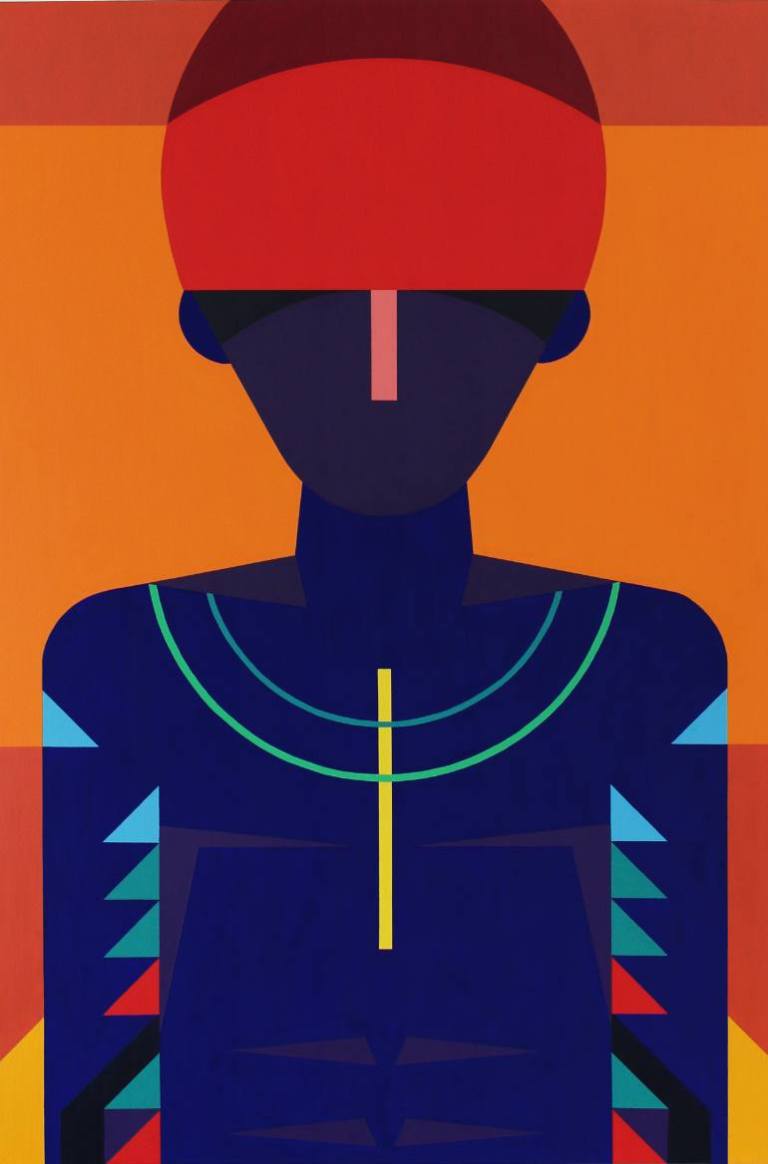 Gustavo is forever open to learning about the latest findings on chemical and physical phenomena, just anything related to space and time. Hermetic thoughts and architectural design also play a role in defining his style and content. He somehow manages to mingle the distinctive traits of all his favourites – the surrealism of Magritte, the colours of Matisse, the obscurity of Hilma af Klint, the clean lines and curves and shades of Frank Stella and Max Bill. Some of Gustavo’s paintings also give the impression of being pictorial documents on anthropology. They record the perseverance and adaptability (or lack thereof) of old cultures and societies in a manner that is similar to that of artists San Poggio (Argentinian) and Tarsila do Amaral (Brazilian).