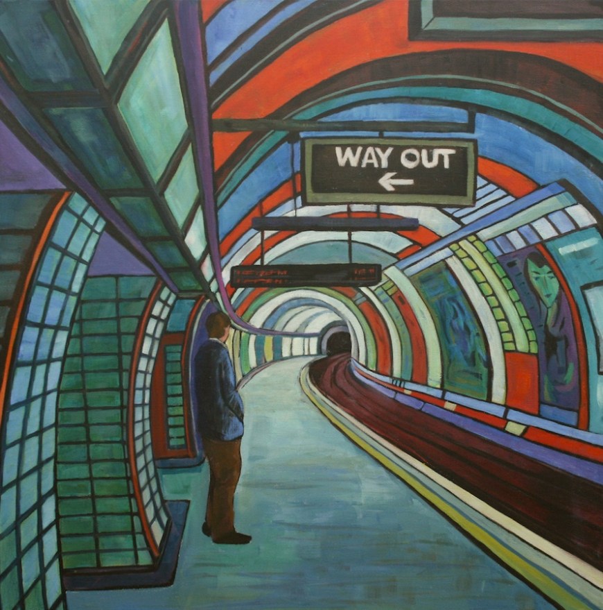 The Tube, through which all sorts of people engaged in all manner of enterprises pass all the time, is London-based painter and printmaker Gail Brodholt’s beloved subject. Born in South London to a Norwegian father and a mother from Trinidad, Gail is a Fellow of the Royal Society of Painter-Printmakers (RE). “I suppose what I’m really interested in is those unconsidered and unnoticed places that people pass through. They are on their way to somewhere else, presumably more important – on the escalators, on the tube, train station platforms, motorways…” she says, echoing the young Slovakian artist Marek Jarotta (see the post “Non-Places” from August 10, 2016).