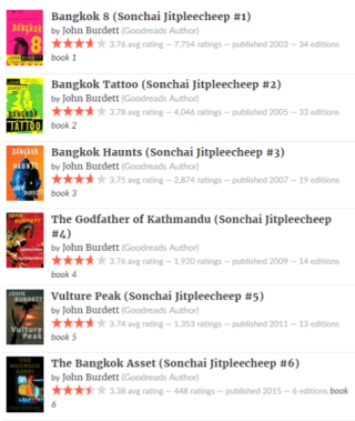 The lead character Jitpleecheep is a “half-caste” – part-Thai, part-white. Born to a Thai bar girl and an American GI in the Vietnam era, he is a devout Buddhist, an arhat (“saintly”) cop who is surrounded by impurity at all times but never gets submerged in it. As of now, the collection consists of six crime novels: Bangkok 8: A Royal Thai Detective Novel (1) (2003), Bangkok Tattoo: A Royal Thai Detective Novel (2) (2005), Bangkok Haunts: A Royal Thai Detective Novel (3), The Godfather of Kathmandu: A Royal Thai Detective Novel (4) (2010), Vulture Peak: A Royal Thai Detective Novel (5) (2012) and The Bangkok Asset: A Royal Thai Detective Novel (6) (2015).