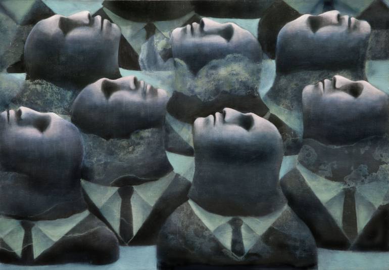 For Nadja, sources of inspiration are everywhere, present in the day to day disclosures of life. Her paintings are highly existential in nature – she examines freewill, our fears, the limits of our cognition. The epicenter is the person – isolated, framed in constant questioning of reality, hovering between the dualism of consciousness and unconsciousness. There is a larger dimension of social criticism in the work as well, especially reflected in the way Nadja depicts the hollowness of modern corporate culture.