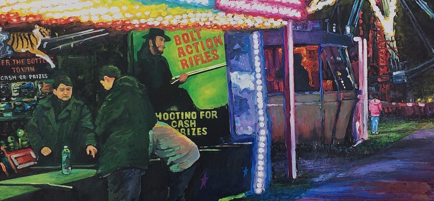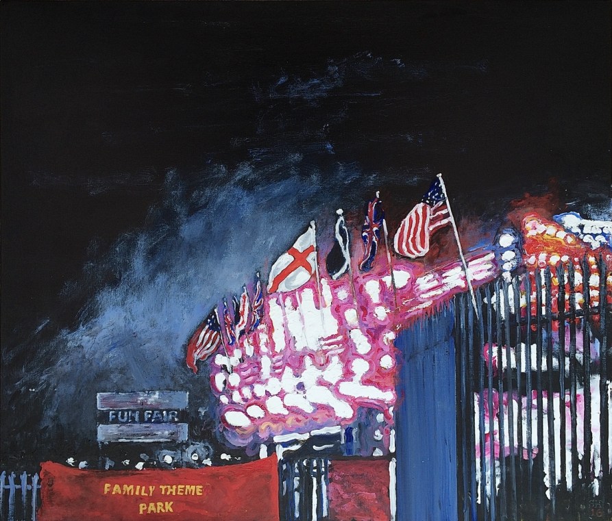 “My main message would be that beauty is much wider than conventionally accepted – arguably universal – and not something confined to elegant shapes or particular types of subject,” continues Simon. “I focus on unloved urban scenery to show its beautiful side, as well as for its social relevance. My other message, especially of late, might be called political: it seems the UK is increasingly dystopian, and I try to combine scenery with a sense of contemporary malaise.” This is especially evident in the paintings of flames and flags that spell the eruption of a stubborn nationalism unwilling to entertain whoever or whatever is different and foreign.