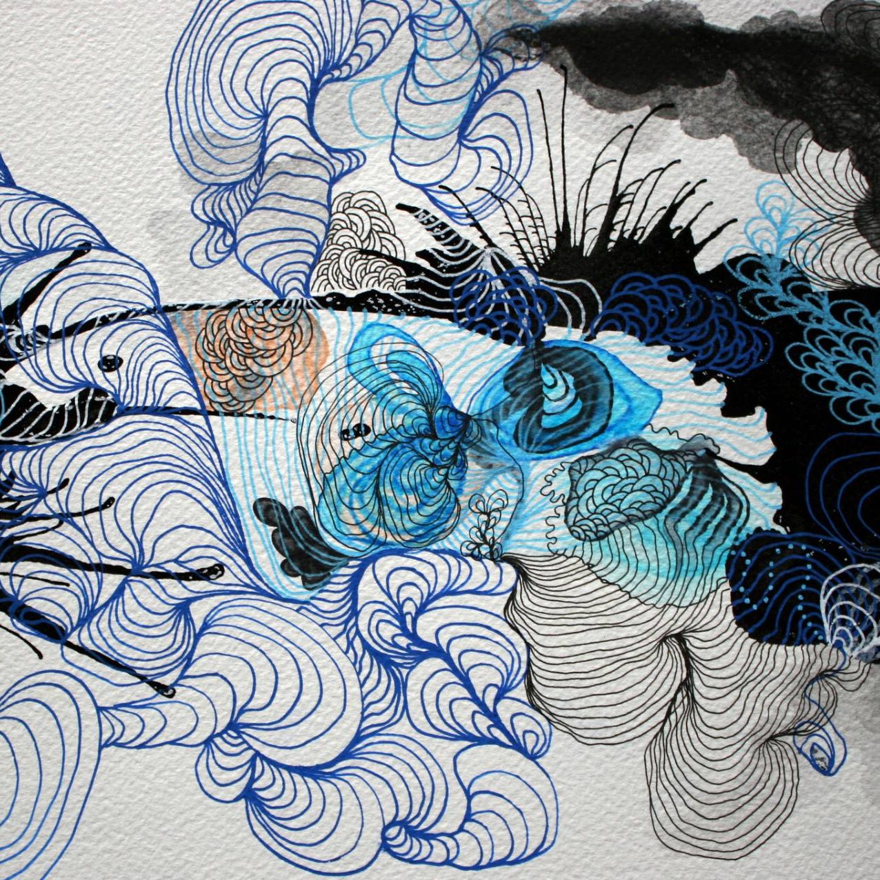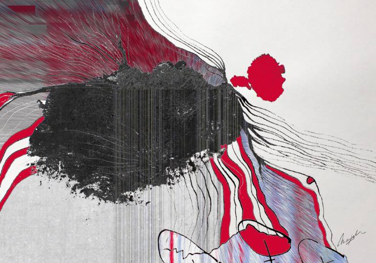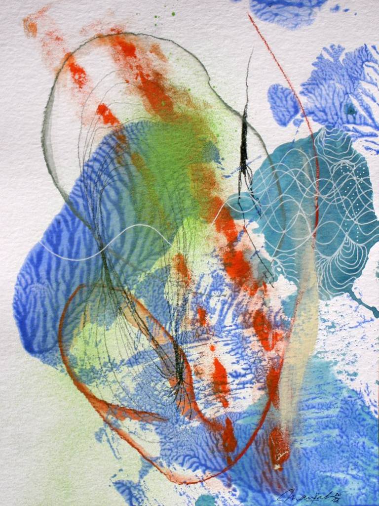 Marijah considers herself a curious and impulsive artist who does not want to be locked into a single style or artistic expression. In her paintings, she plays with appearances, combining what – according to her – are “fragments of faces and animals” in organic threads. The pieces look like evolving molecular strands of matter and colour, works-in-progress that hope to condense to form some kind of meaningful whole.