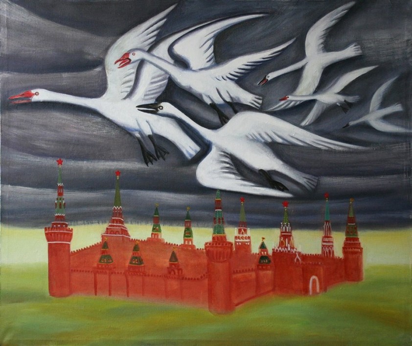 She conveys an implicit melancholic message to the viewer: “Look, there’s a secret life of things, of nature and man! The night is alive as in Hoffmann’s stories, spirits whirl before Christmas as in the fiction of Gogol. We have our being on a phantasmagorical plane of existence, full of talking plants, young mermaids, moving buildings and menacing vessels full with laughing gas. The world of old tales and urban legends is our own – free, chaotic, fascinating. The world is not what you see, it has a hidden meaning, love and beauty.”