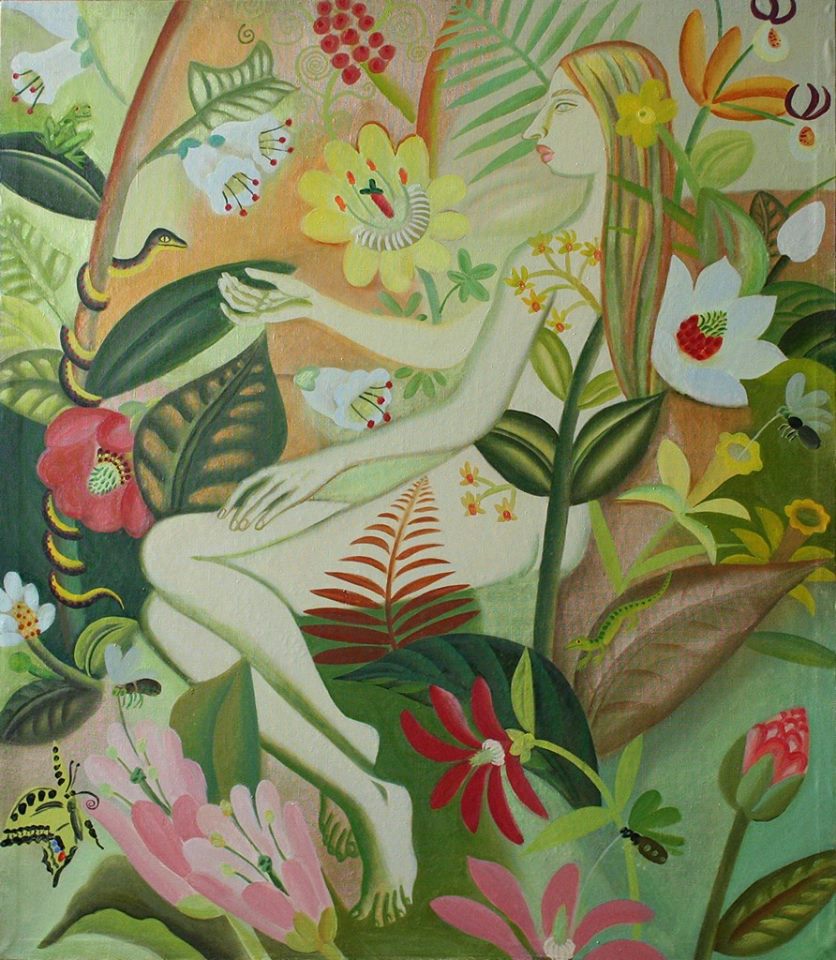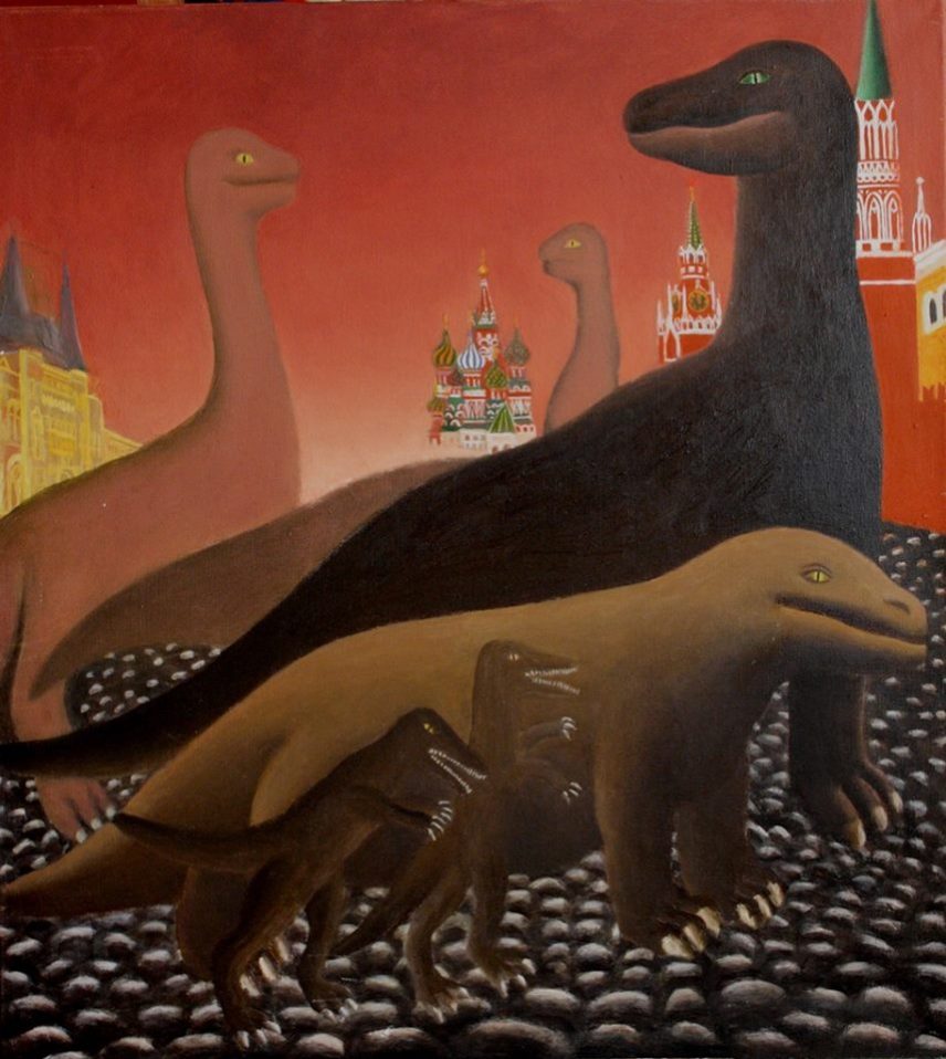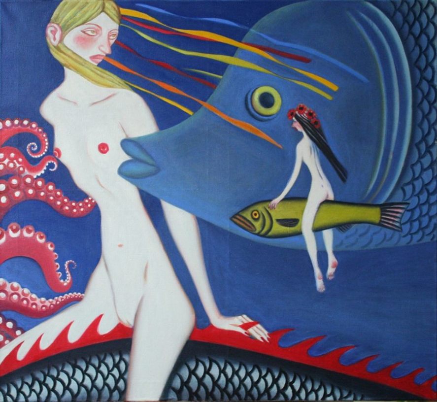 Gigantic bottles of vodka and dinosaurs in Moscow, little women riding fish in the sea…resting among flowers and fruits – the art of Sasha Vlasova (born 1978) emerges out of an interest in architecture, music, painting and a great deal of literature.