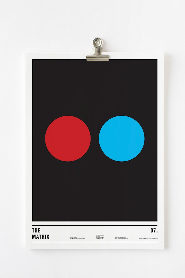 Australian designer and art director Nicholas Barclay is known for his trademark minimalist rendering of pop culture products. He strips movie posters, album covers, corporate logos, fictional characters, modern cities, human psychological states to their very essence and projects them in simple rectangles or circles or strips of colour.