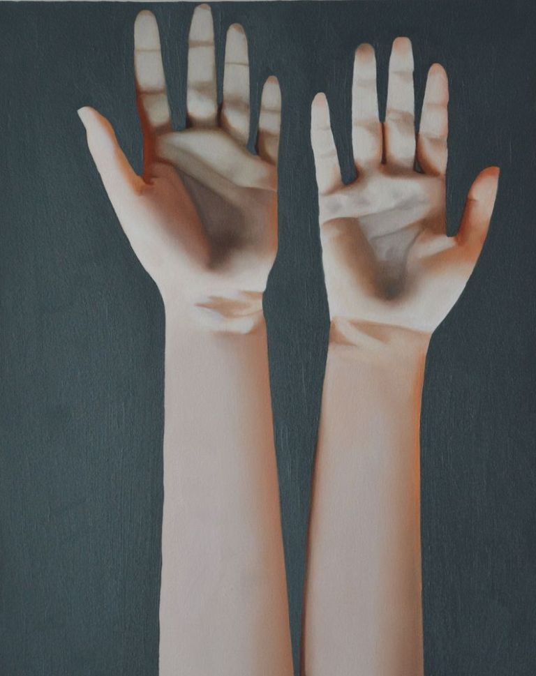 Tracy on her series “Sterility”: “This one is a body of work with some of the paintings referenced around images of sex dolls: their hands, feet, face, etc. While the work was figurative – which is typically an intimate subject of painting – using these images made the work empty and, ‘sterile’. Though the paintings are of familiar and recognizable body parts, they are simultaneously impotent and lifeless. Other pieces in the series are cropped with flat swaths of paint, also referring to a sense of feeling hygienic and antiseptic.”