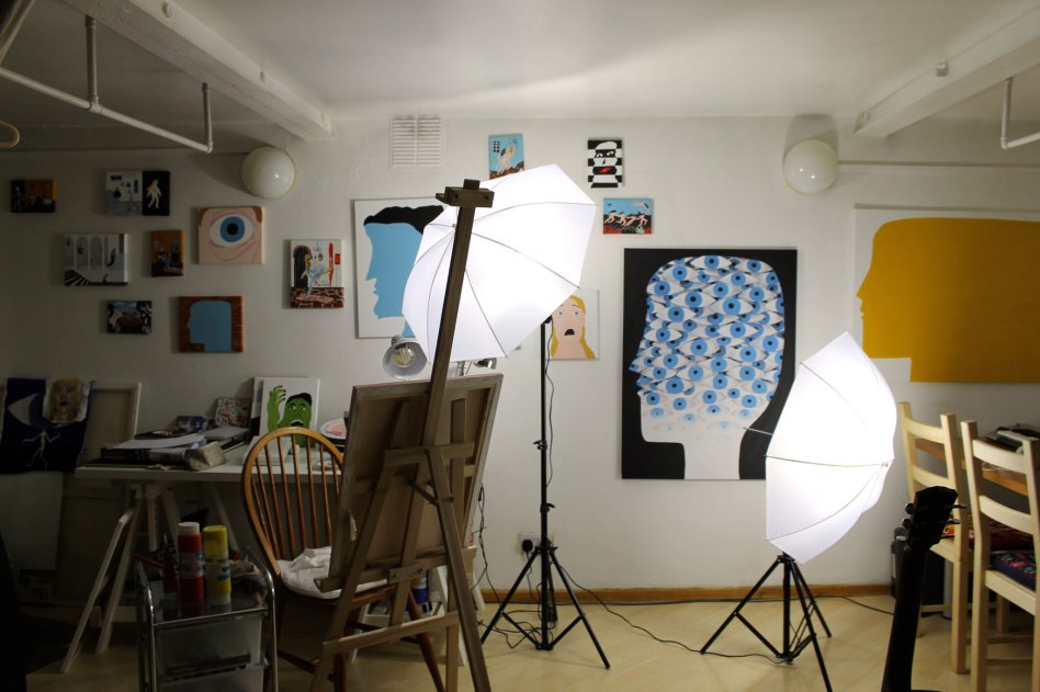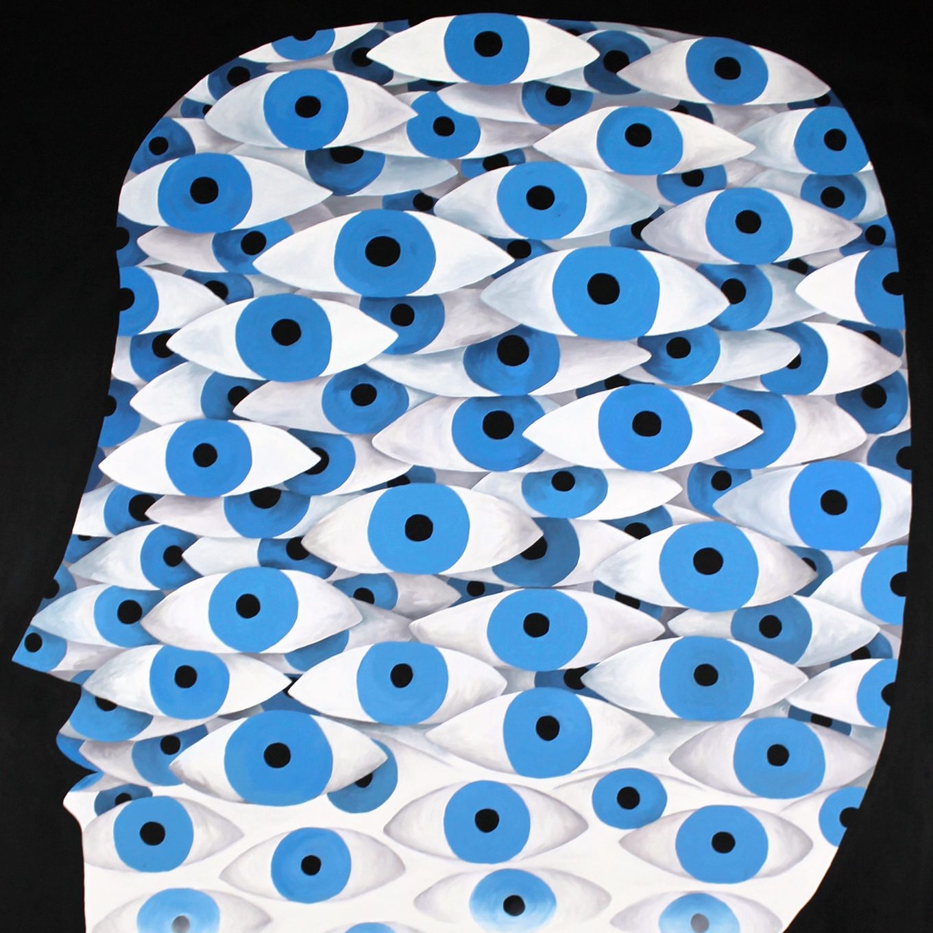 Originally from Argentina and currently pursuing an MA in Animation at the Royal College of Art in London, Kitty Faingold has a painting portfolio that is full of human heads big and small. And eyes – sometimes filling a face or set against plain backdrops – alone, in pairs or large groups. The colours Kitty uses are solid and loud – blue, orange, red, pink, occasionally gold. Emotions of anger and pain naturally emerge. So do themes of judgment and surveillance. Overall, the art retains an attractive hallucinatory air. It looks like an unpacking of the subconscious.