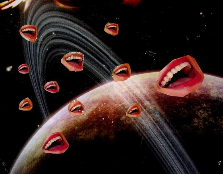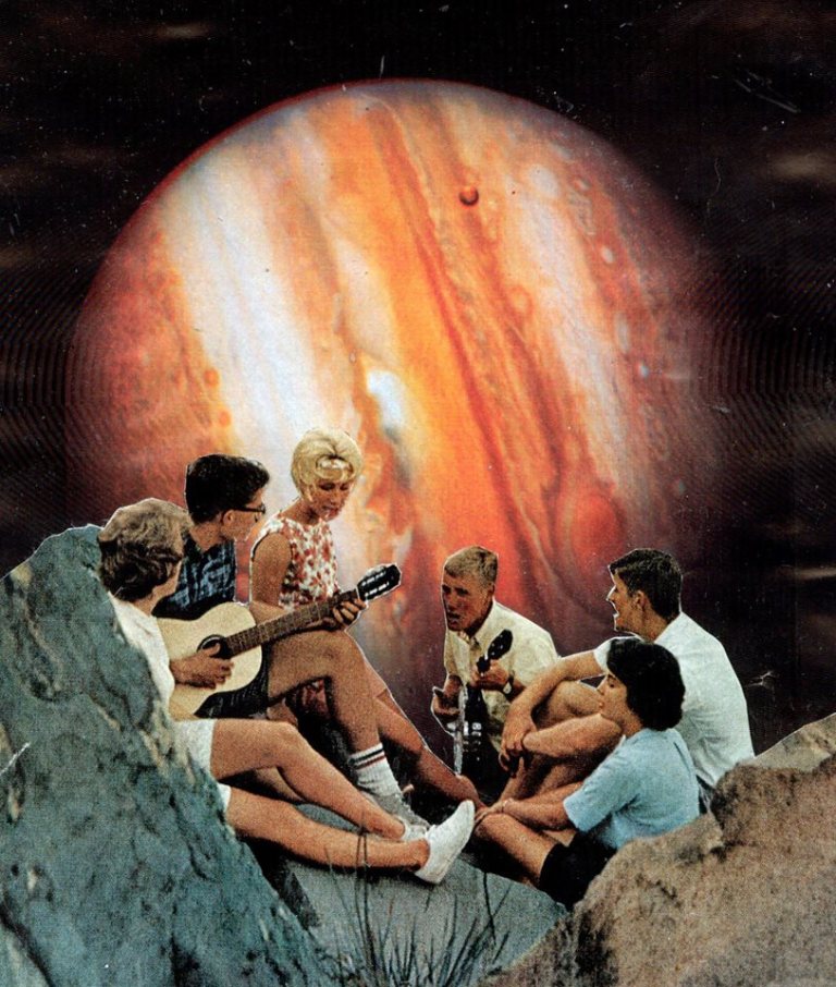 Combining cosmic and domestic imagery, Jon Garbet makes hilarious collages in which headless lovers dance in gardens, groups of friends holiday on distant planets and commodes become works of art.
