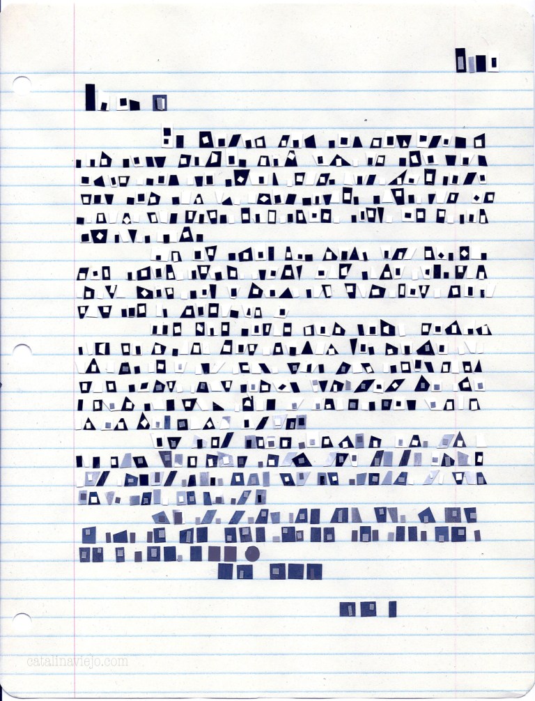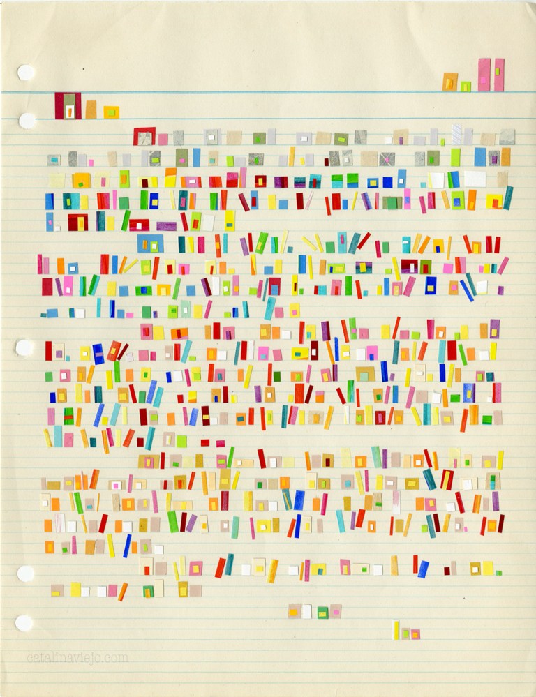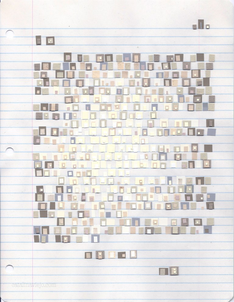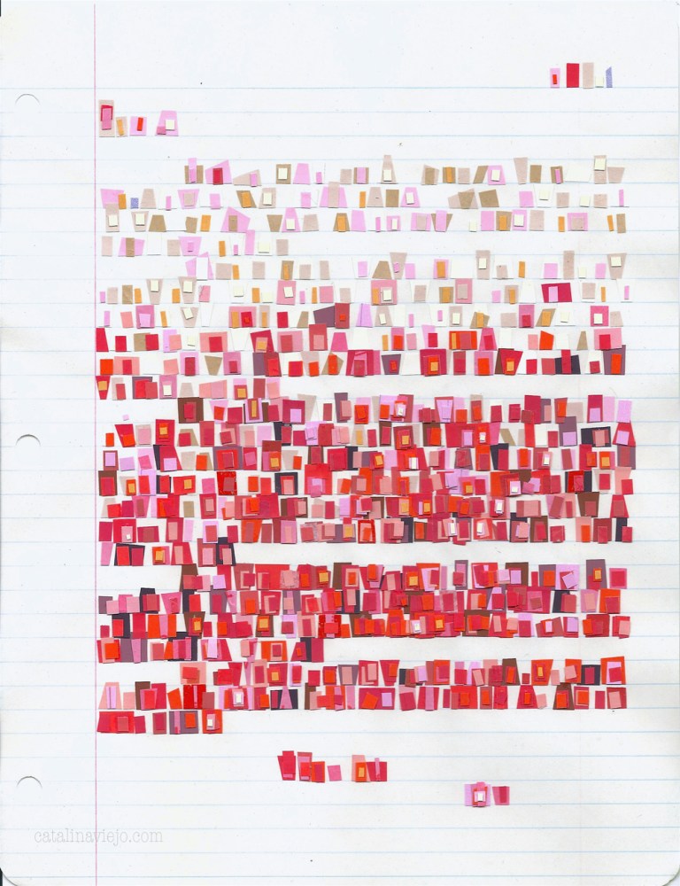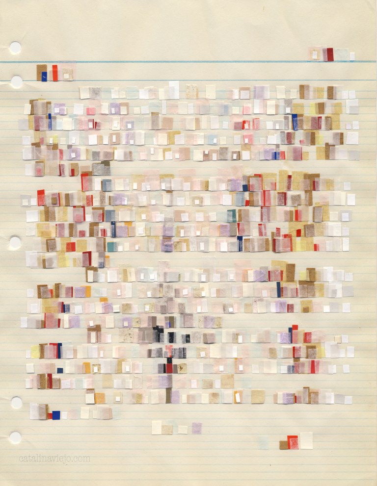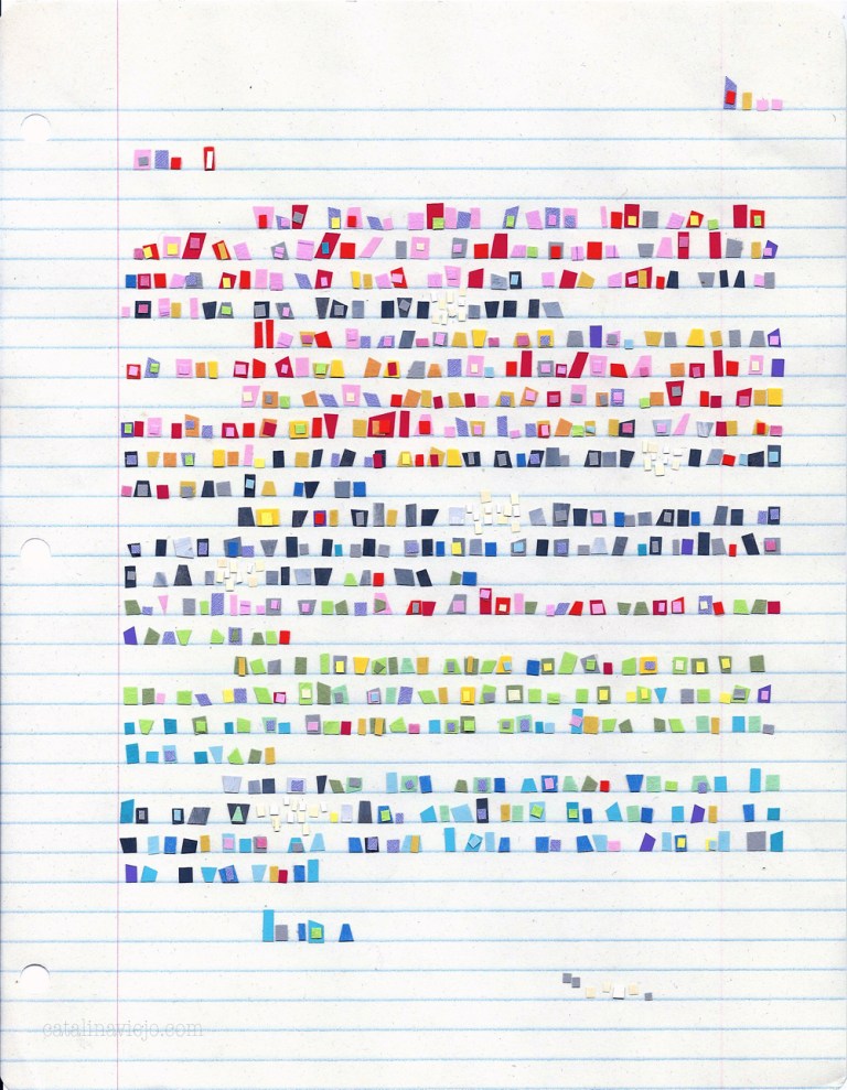 In her “Letter Collages”, artist Catalina Viejo Lopez de Roda – originally from Malaga, Spain and now living in Hudson, New York – conveys colour-coded messages to concrete figures like her own body and the people she knows, and also to more abstract phenomena like emotions (“Happiness”) and states of mind (“Overcoming My Fears”). The series is pure consciousness translated into minimalistic little blocks of varying shades, and should be experienced and felt intuitively rather than “reasoned out” in definite terms.