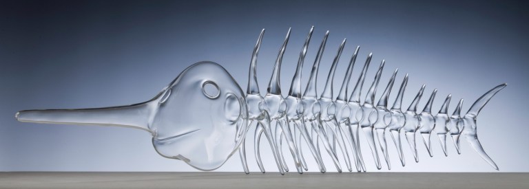 The sculptor started working with glass at the age of 15 at the Massimo Lunardon glass factory. He opened his own atelier after a 10-year-long apprenticeship. Initially having experimented with the traditional Murano glass, Simone now uses borosilicate glass and applies to it a special technique of flame that he calls “Hollow Sculpture”. This particular way of working allows him to create large-scale intricate objects.