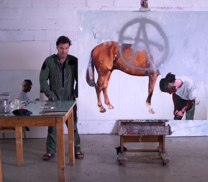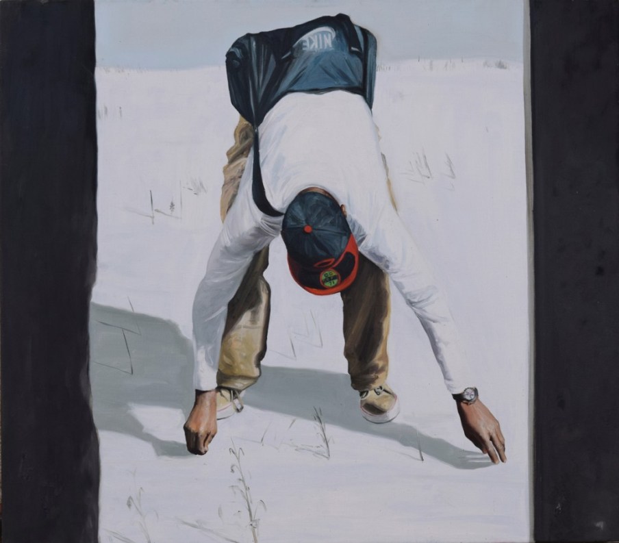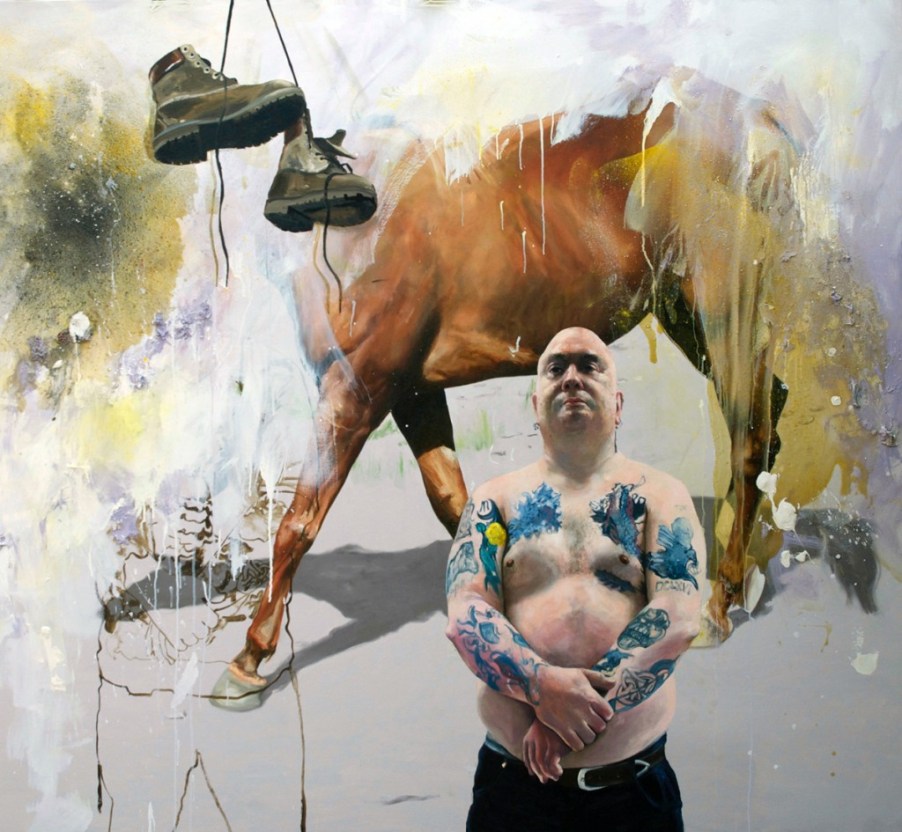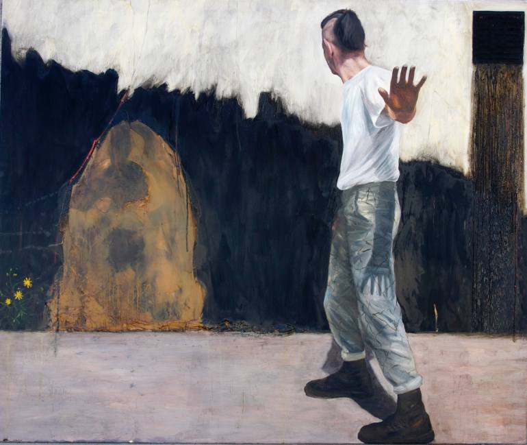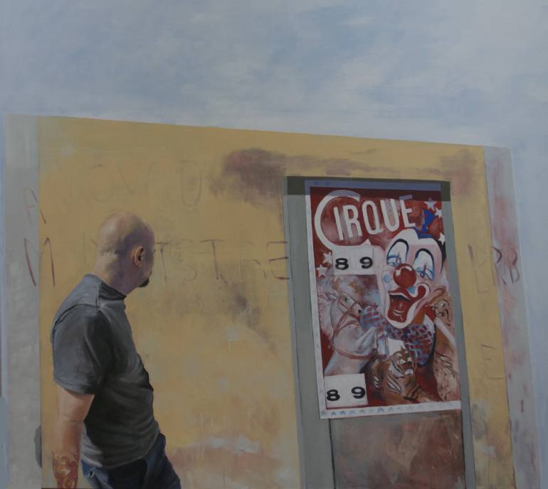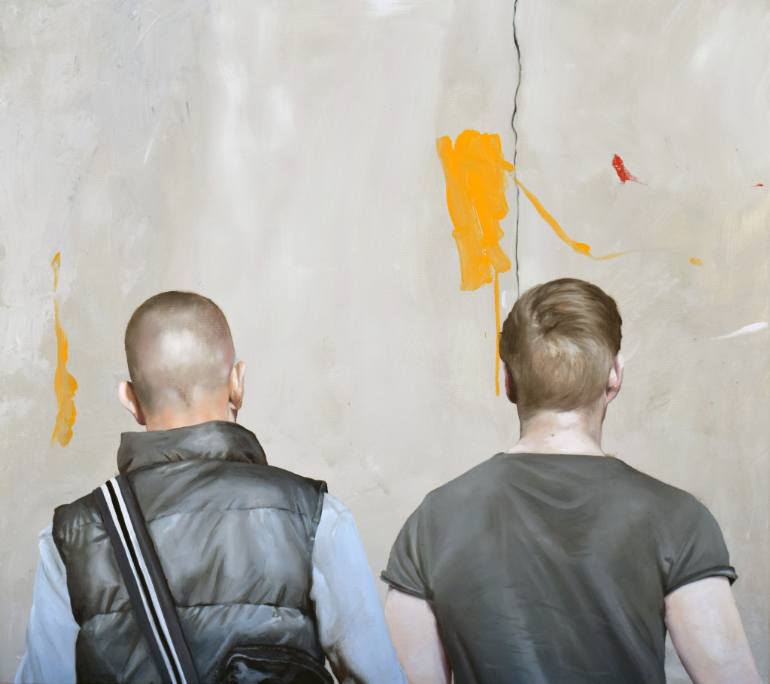 The art of Chris Stevens (born 1956) – a painter based in London and Caunes-Minervois, France – revolves around figures on the fringes. His characters are mostly men – young and middle-aged, white and black, at once flawed and strong – trying hard to fit in some or the other subculture and assume a definite identity. Some are bald, some tattooed – standing against faint and distorted graffiti or advertisements. An element of rebellion runs through all the frames. It is as if these people want to attack the injustices of the established order or simply break out of its monotony and boredom.
