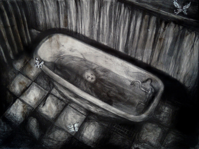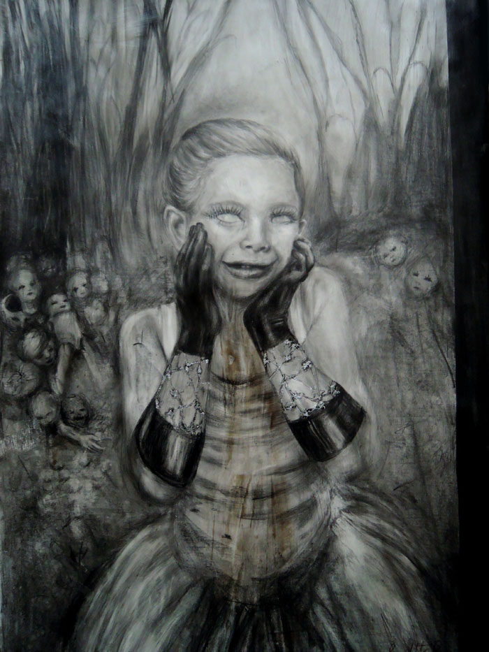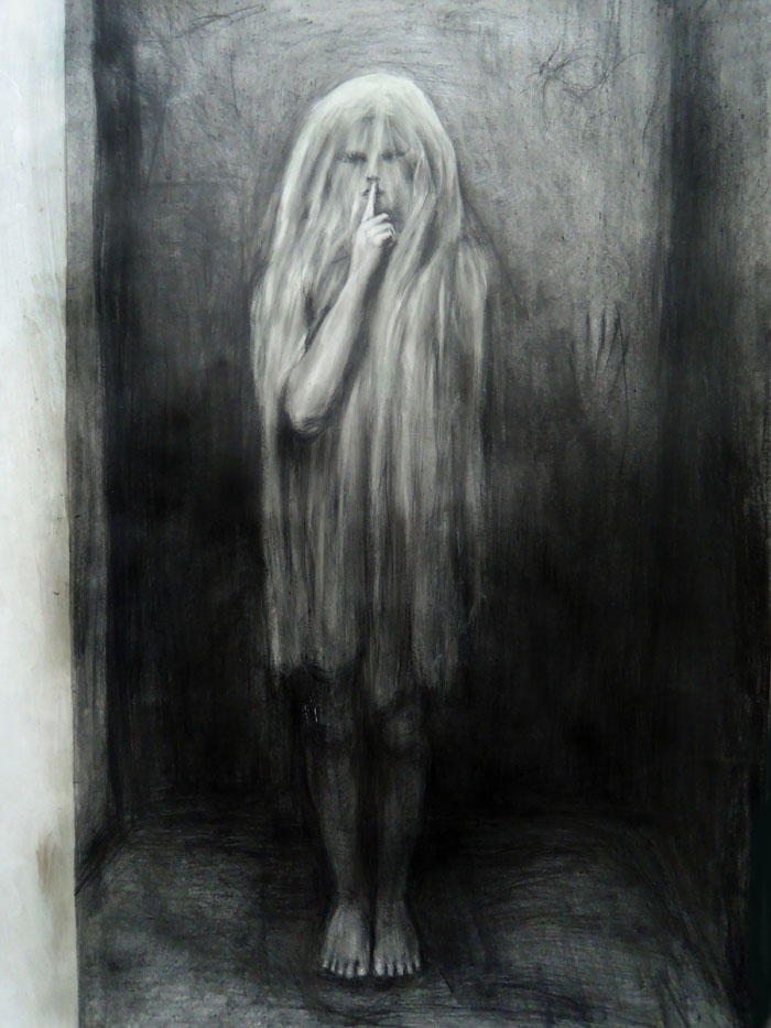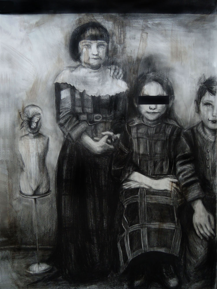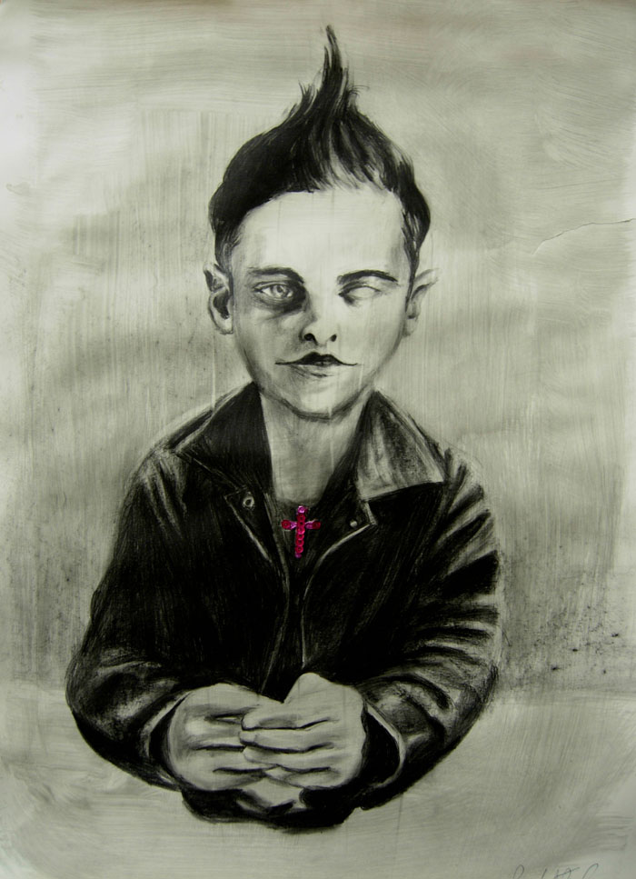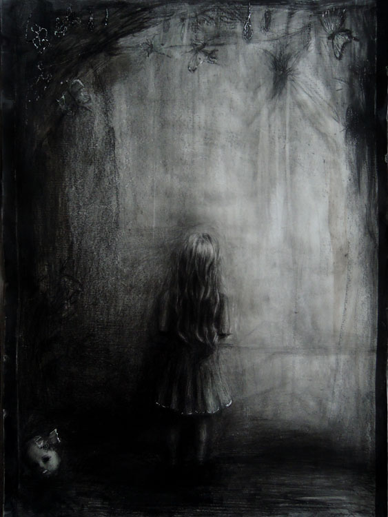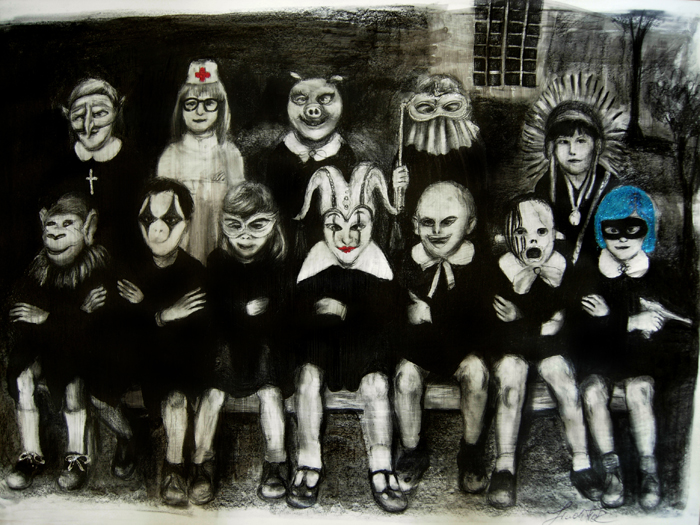 Interested in hallucinations and nightmares, Giuditta R. (born 1984) creates highly atmospheric drawings of twisted individuals or groups hiding shameful secrets, indulging in their delusions, wearing masks or withdrawing themselves in fear. Her main inspirations are the movements of Expressionism and New Figuration. She is also influenced by literature on criminality and parallel dimensions of being. The unconscious, ambiguities, paradoxes, metaphysics…