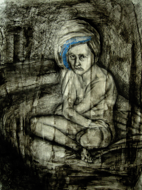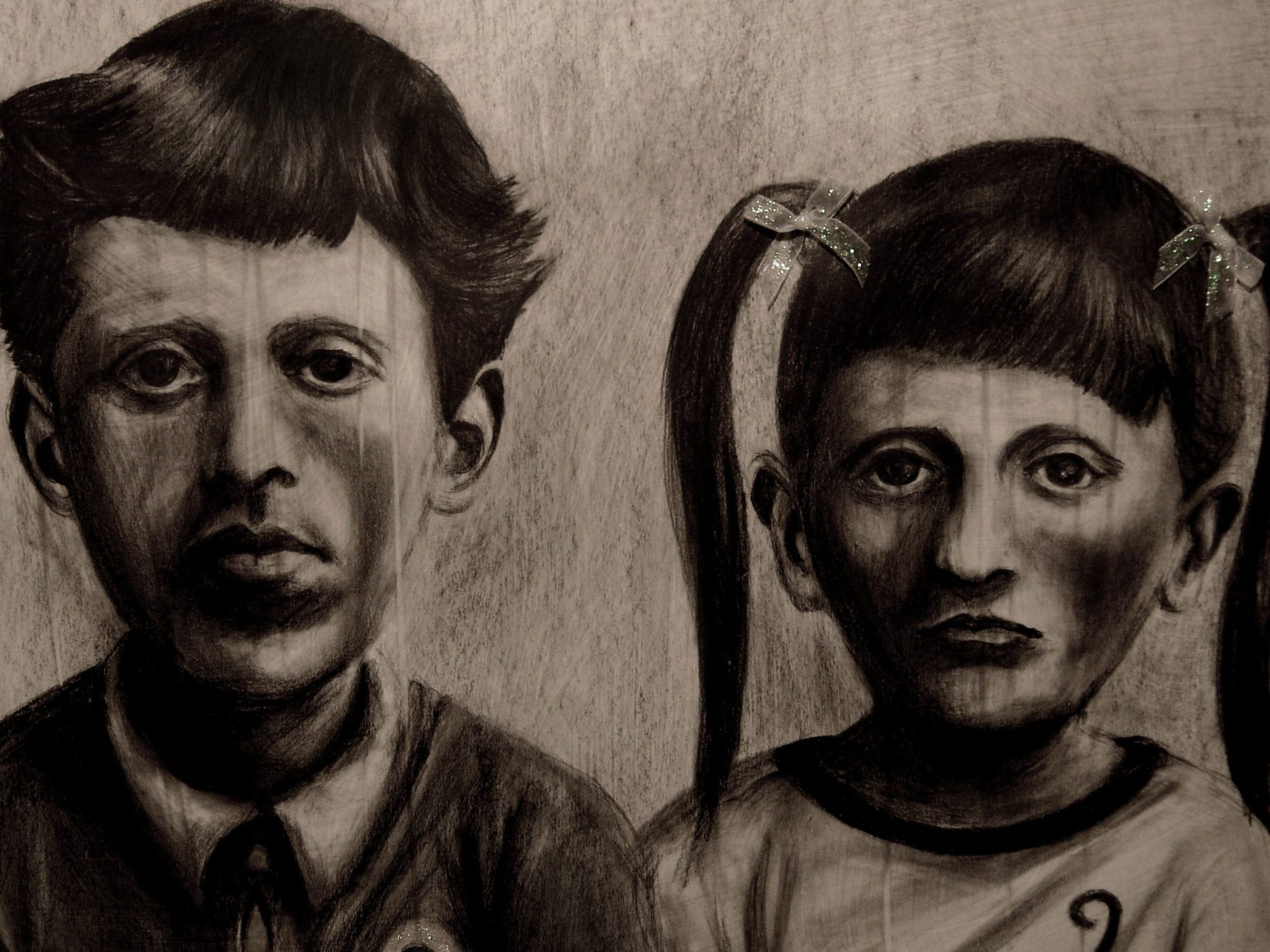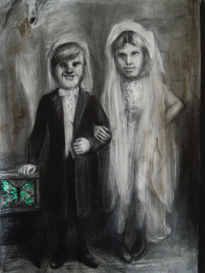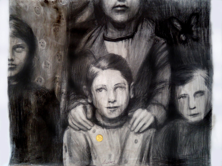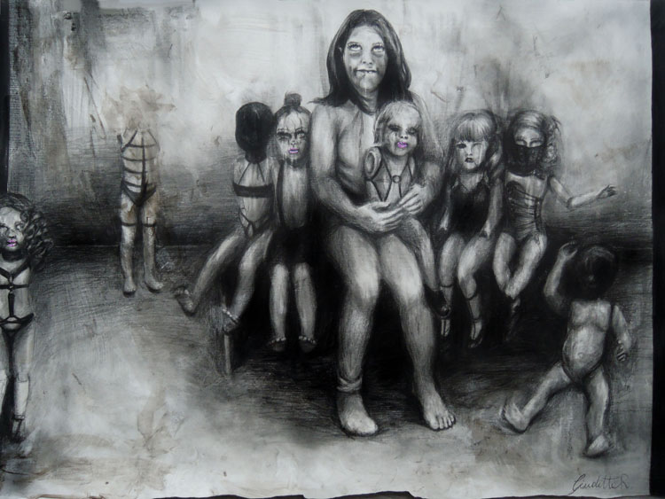 Despite the shadows and the madness, the artist’s message remains one of hope and not resignation or despair. She explains: “I create most of my artworks by using graphite and mixed techniques on cardboard. They are generally made in black and white. Only little particulars are underlined, in each artwork, by evident and coloured glitters, shiny spangles and little objects, emerging drastically or with difficulty, from each representation. Small details that shine in the obscurity, bright jewels, hamlets, lucky charms, indicating hope for a future of consciousness. These bright elements symbolise the eyes of conscience, giving light to the darkness.”