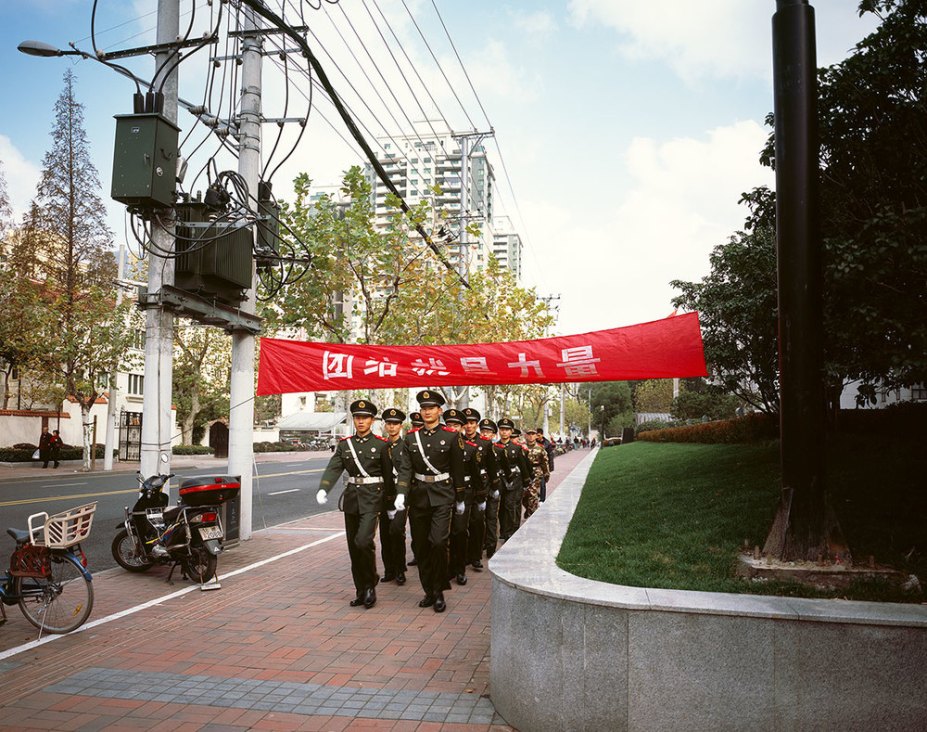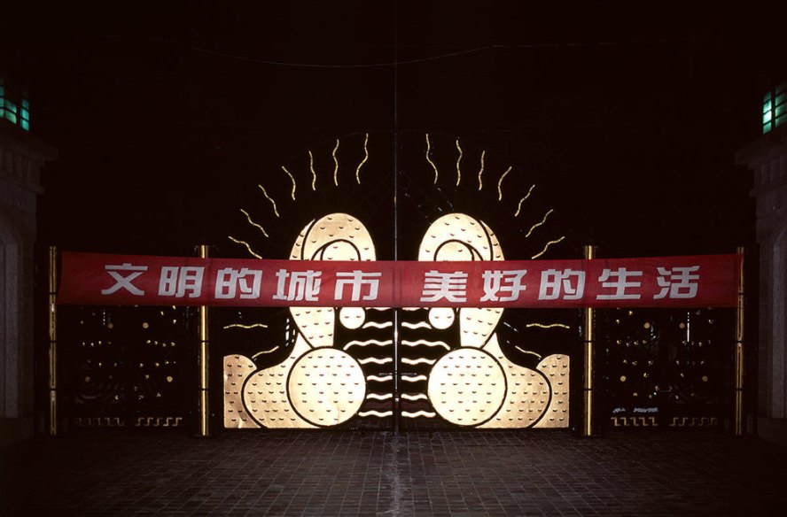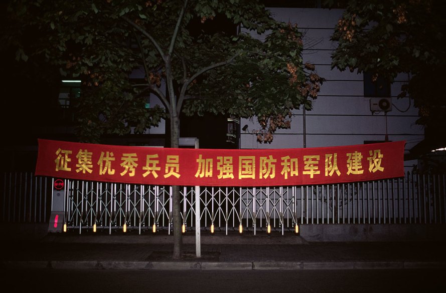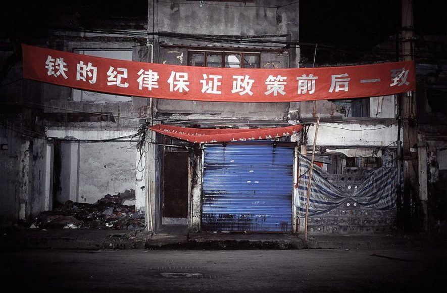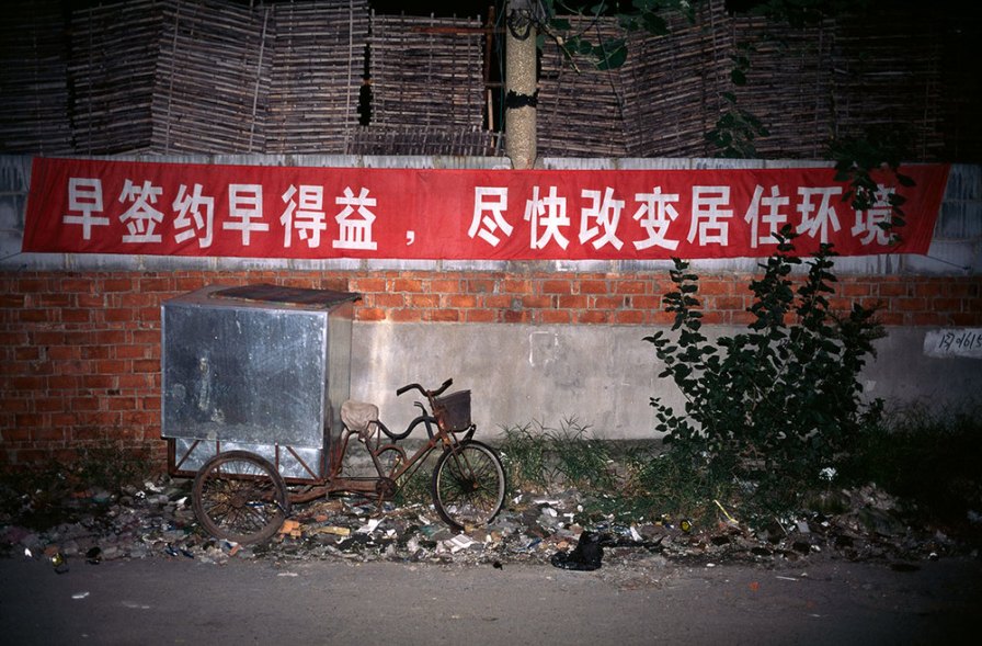 Puzzled and disturbed by sentences such as these appearing on red banners in Shanghai’s poor neighborhoods, Eric Leleu (born 1979) began photographing them at night as a spy to learn more. To a foreigner, these words were big and violent and strong but oddly seductive. They were part of the setting, addressed to the locals, meant to programme them so that they’d yield to the developmental, nation-building plans of their government without resistance.