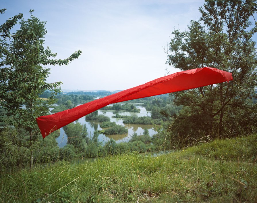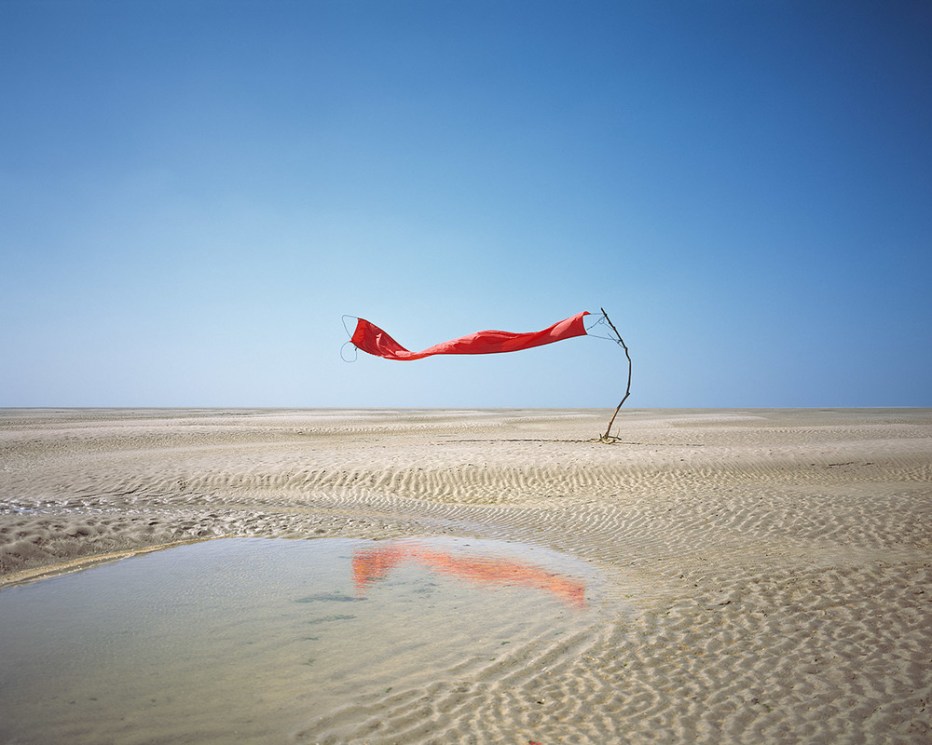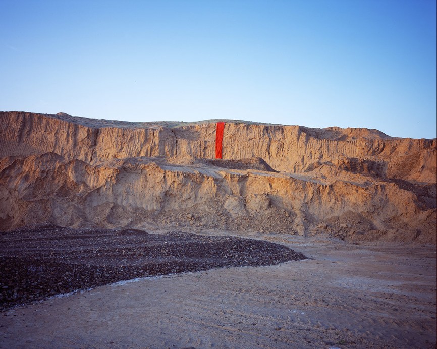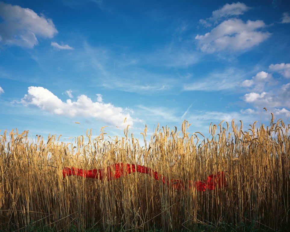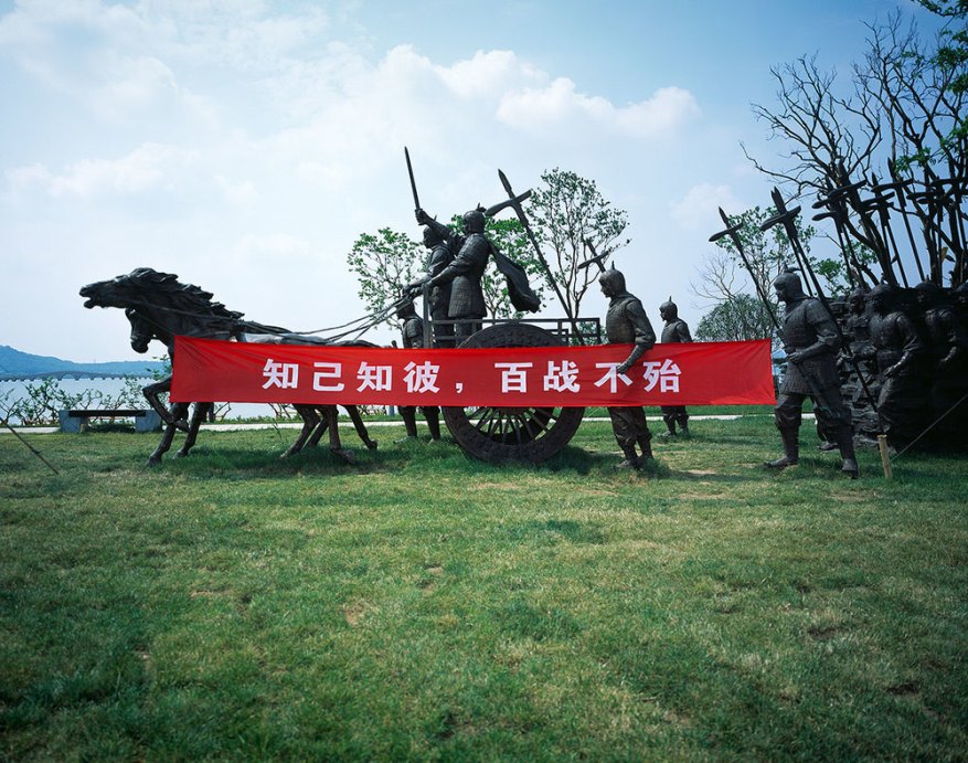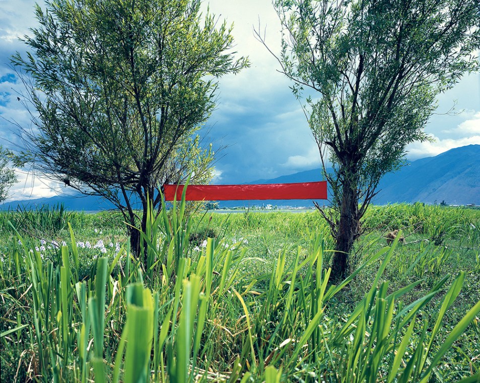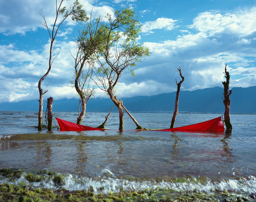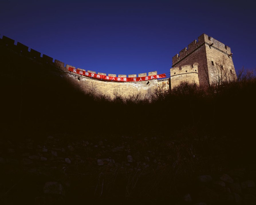 Chapter 1 is called “Authority”, Chapter 2 “Vox Populi” and Chapter 3 “Silent Protest”. The first consists of original official commands and statements left by the government in dark alleys near crumbling houses. The second is made up of unofficial copycat banners containing popular Chinese wisdom and personal thoughts that Eric has himself printed and set up in both urban and rural areas. This is a playfully satirical lot. By substituting bureaucratic Communist slogans with proverbs and harmless announcements on gadgets or landmarks, the photographs turn the practice in on itself. The strangeness of them might actually make a local pause. Finally, the third chapter shows blank red pieces of cloth in natural environments – in the middle of fields, by streams. There is no script here but through the colour and the shape of the banners, one can very well feel the absolute hold of the political elite on all of China – its people, every bit of its soil.