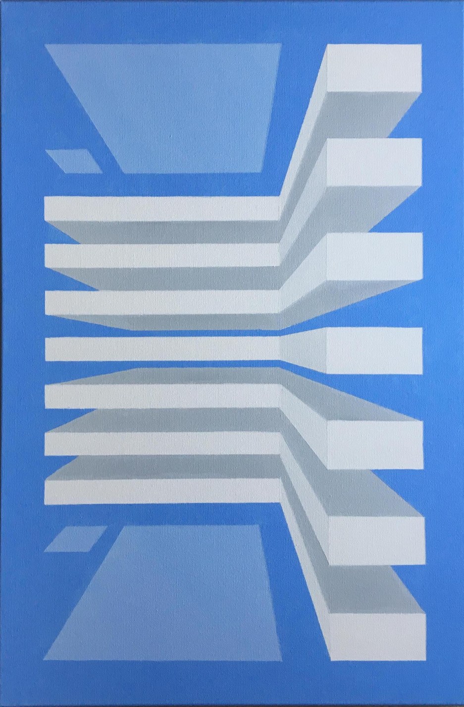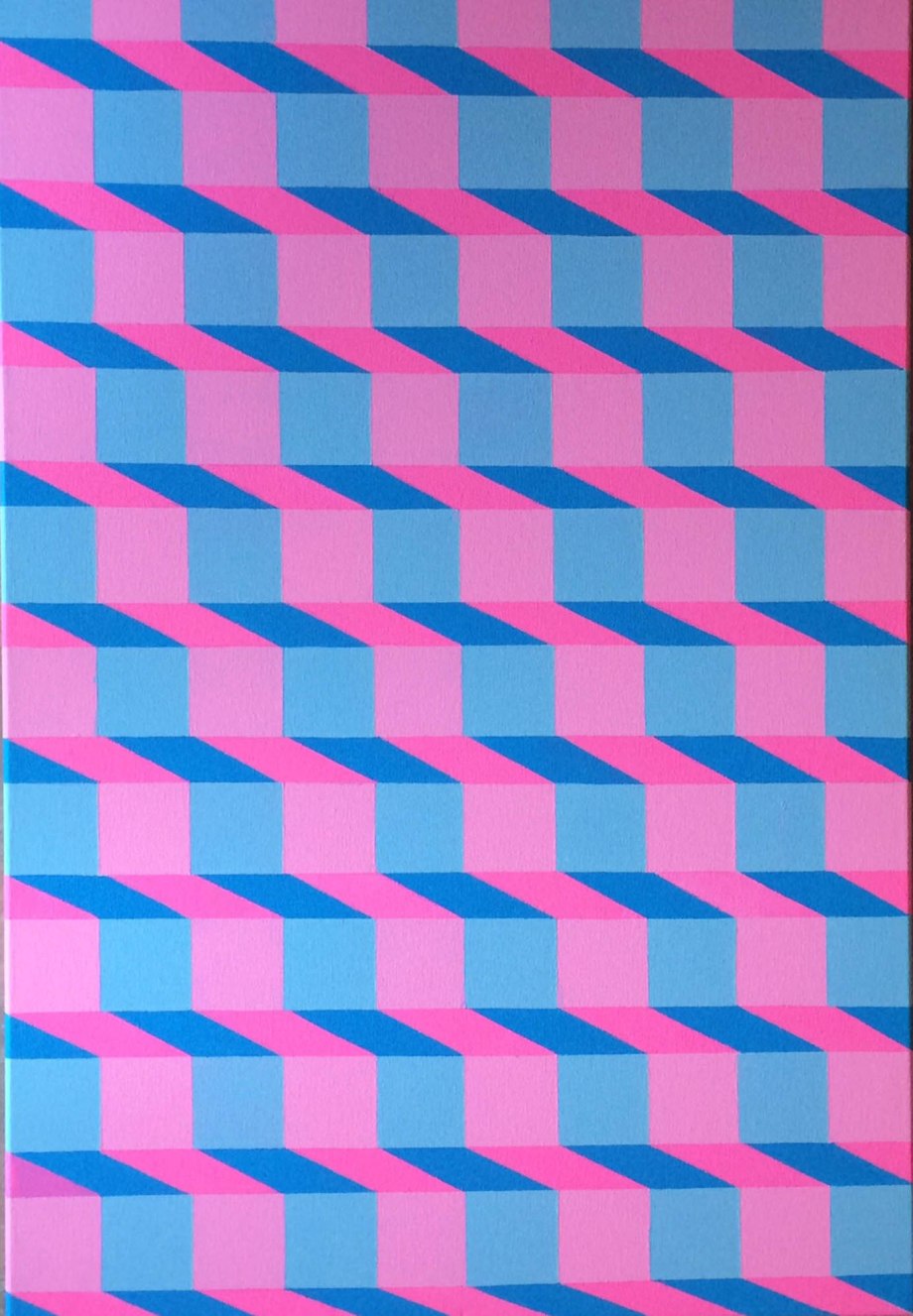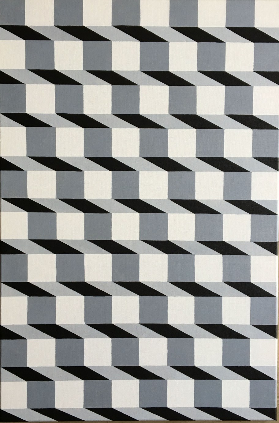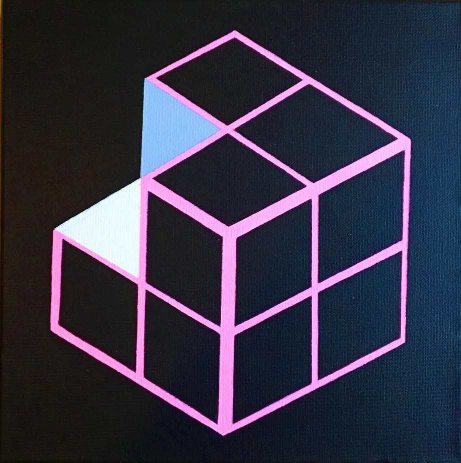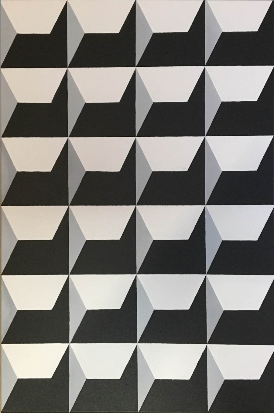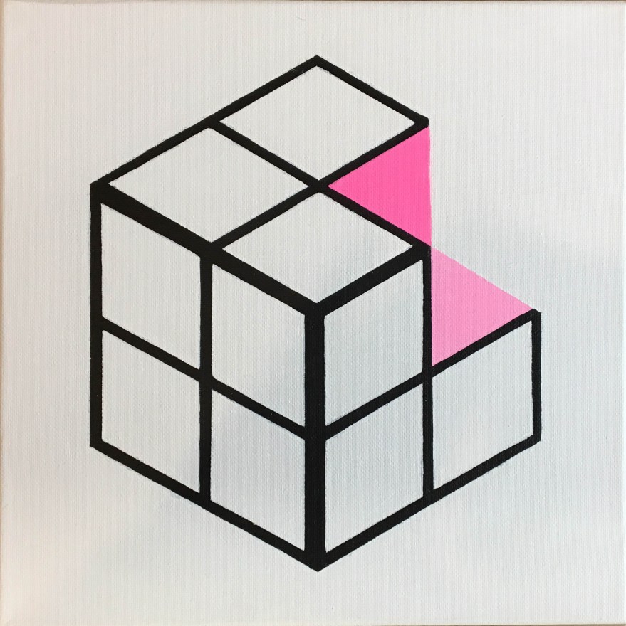 Hampshire, UK-based artist and designer Dominic Joyce creates paintings and prints that play with the viewer’s sense of depth and light using a limited number of colours, mostly white, grey and black. Occasionally, pinks and blues. Blocks, squares and trapeziums appear again and again, generating a sense of strict order and consistency.