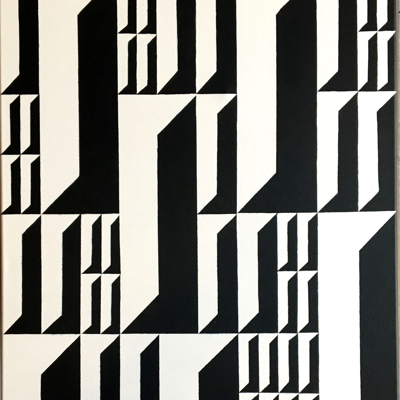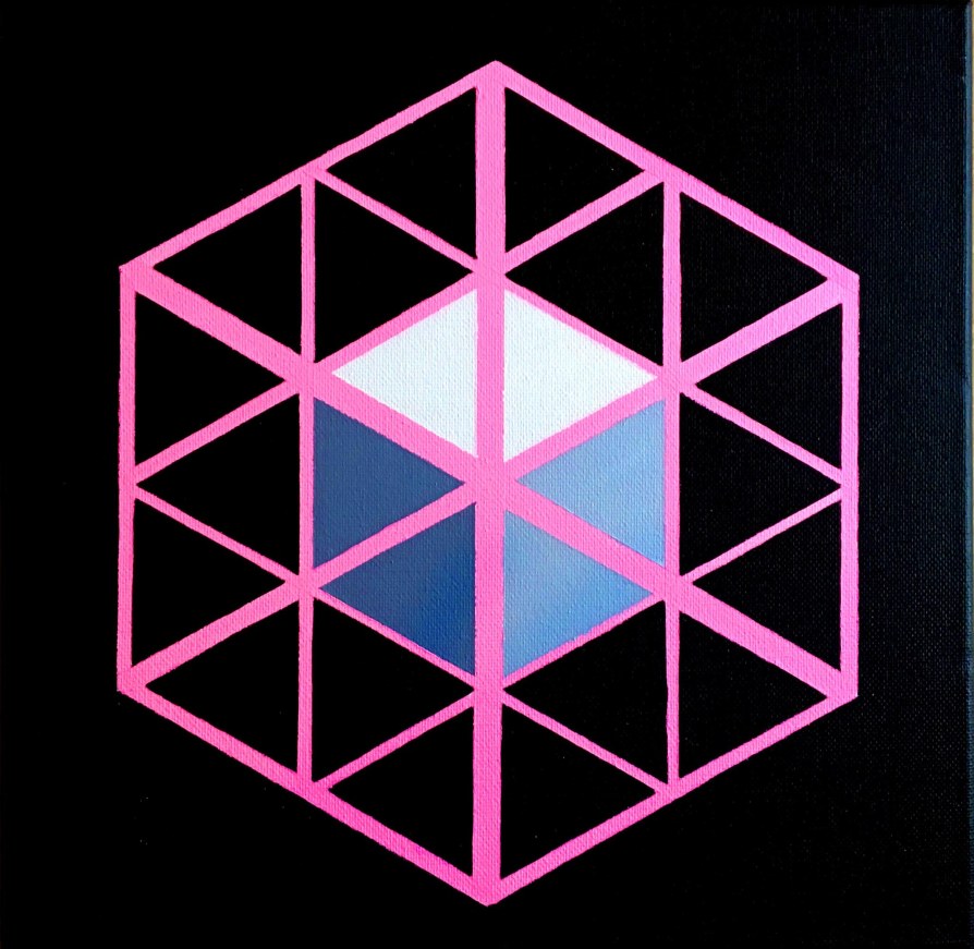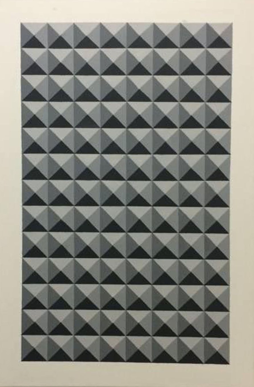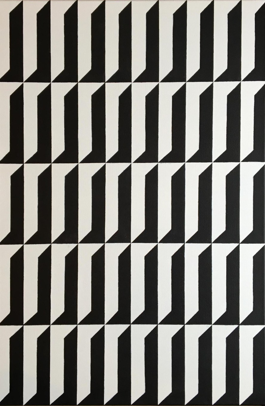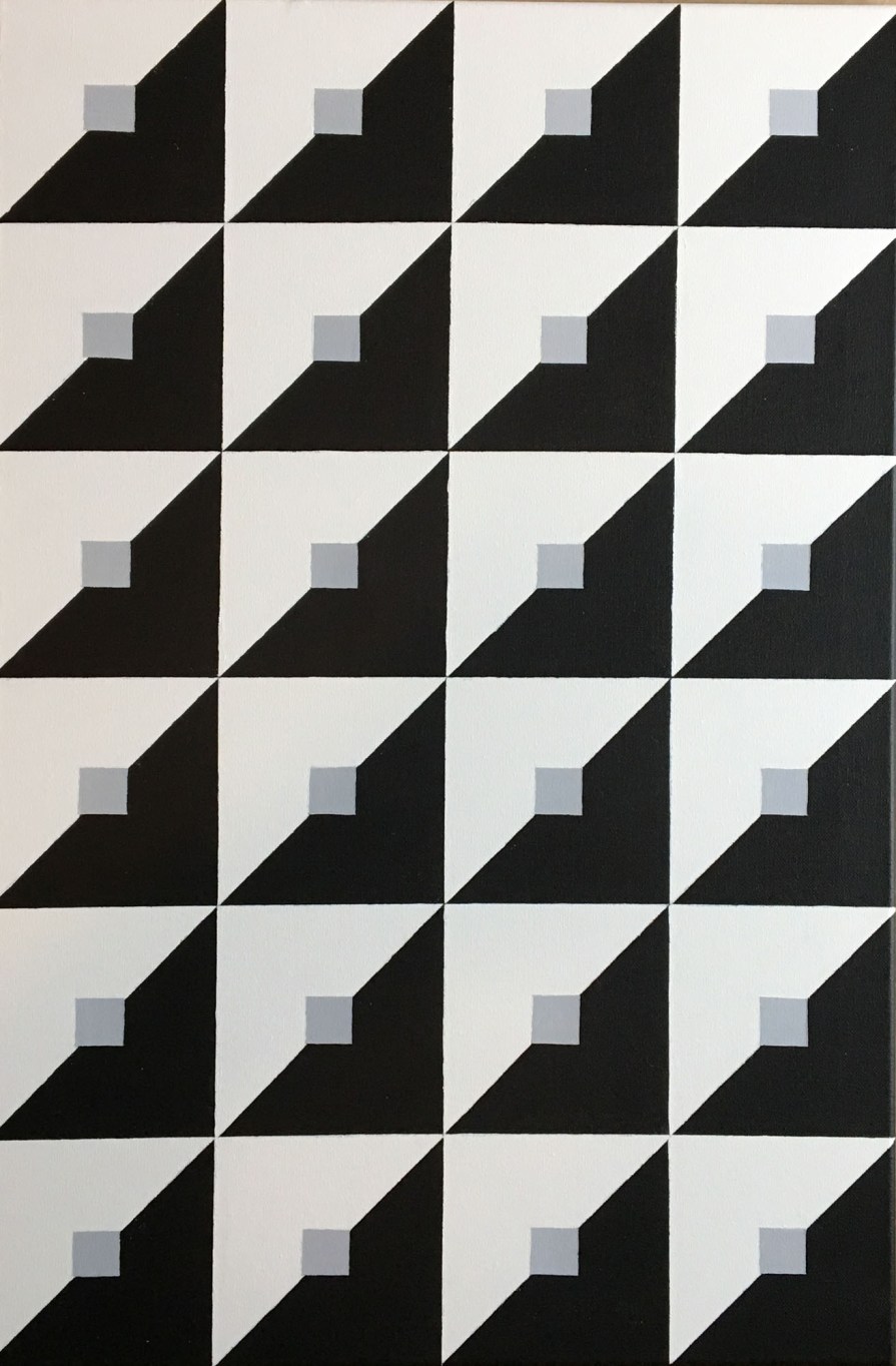 Hampshire, UK-based artist and designer Dominic Joyce creates paintings and prints that play with the viewer’s sense of depth and light using a limited number of colours, mostly white, grey and black. Occasionally, pinks and blues. Blocks, squares and trapeziums appear again and again, generating a sense of strict order and consistency.