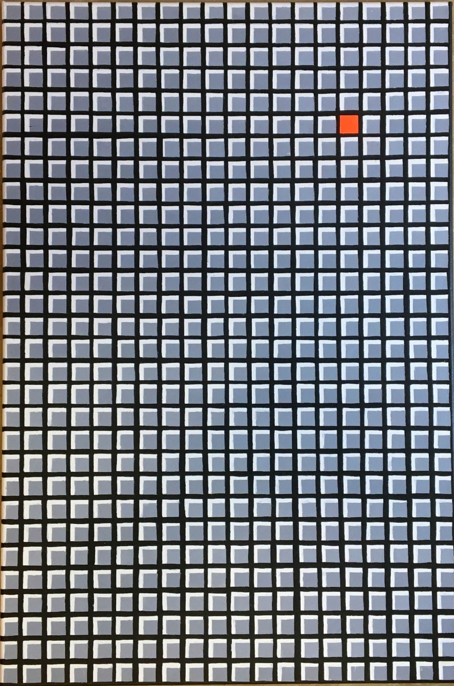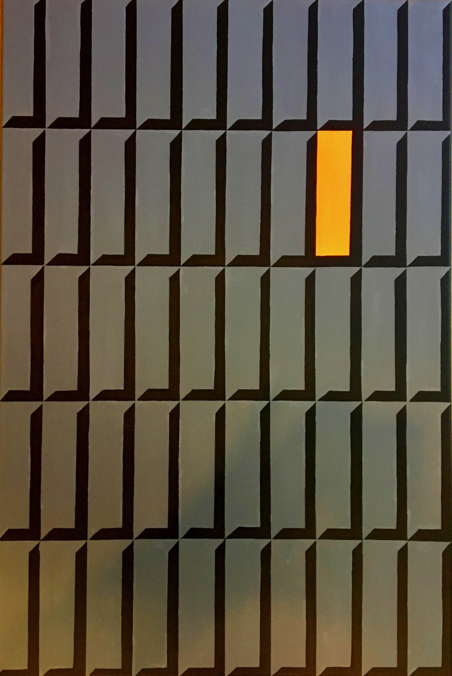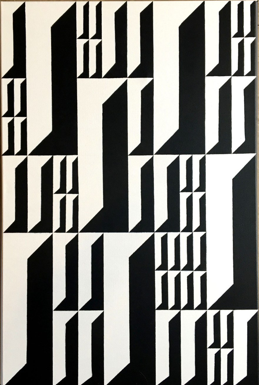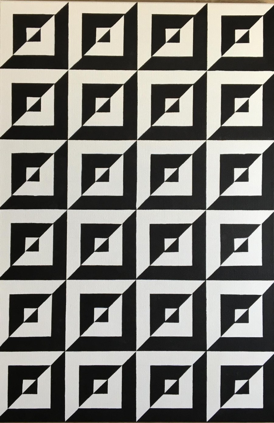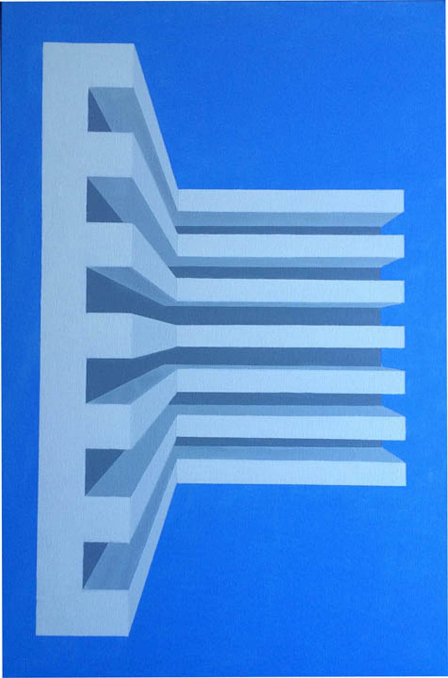 Hampshire, UK-based artist and designer Dominic Joyce creates paintings and prints that play with the viewer’s sense of depth and light using a limited number of colours, mostly white, grey and black. Occasionally, pinks and blues. Blocks, squares and trapeziums appear again and again, generating a sense of strict order and consistency.