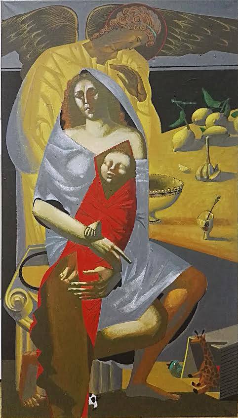 Two females sit in a place like a café, doing something ordinary like drinking wine and smoking cigarettes. But they are goddesses. We know this because they are without arms – a reference to the statue Venus de Milo. A dreamy housewife is at a table, lost, staring into space. But there is more to the story. She happens to be between a sign of infinity and an open door. Then a mother and a baby are comforted by an angel.