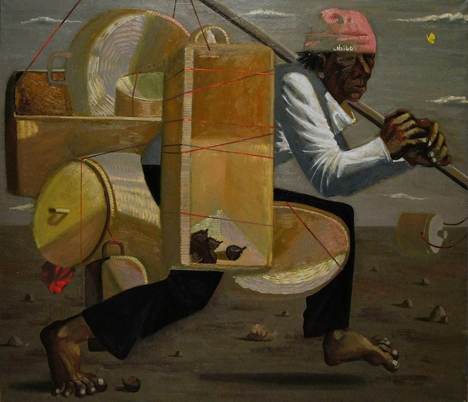 There is also an industrial landscape of electric poles with a dead bird. And a traveller with all sorts of boxes, tubs and containers.
