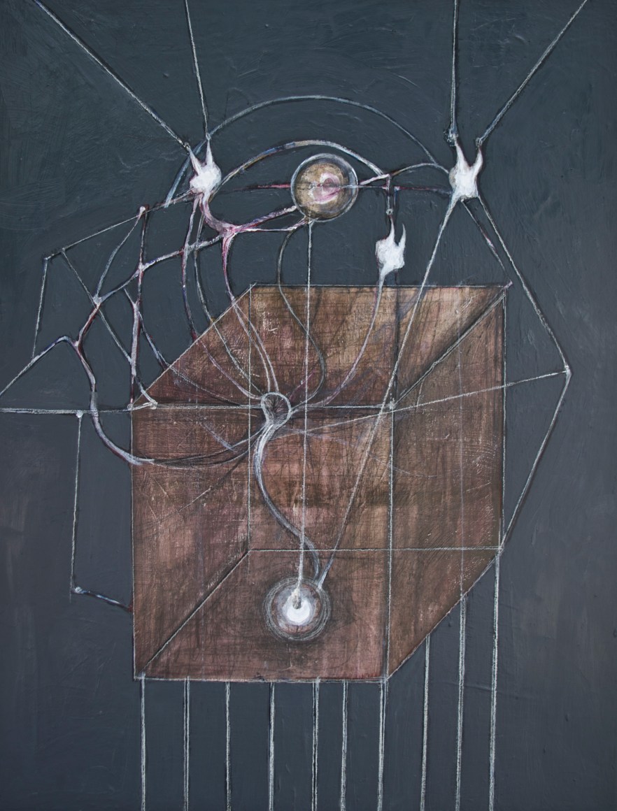 The work of Thessaloniki-based artist Simis Gatenio (born 1976) ranges from poetic expressions of Original Sin to examinations of the subconscious to explorations of dualities like space and time, male and female, love and death. The forms he conjures are simultaneously dreamlike and disturbing, often hybrids of organic matter and geometric shapes. The scenes do not make sense immediately when you look at them. Rather, they seem to communicate the mysterious anxieties of the mind.