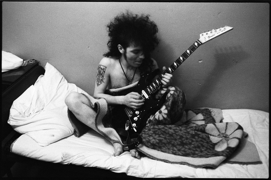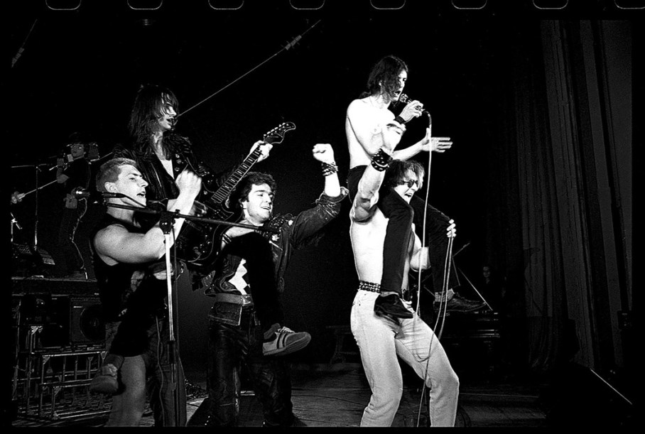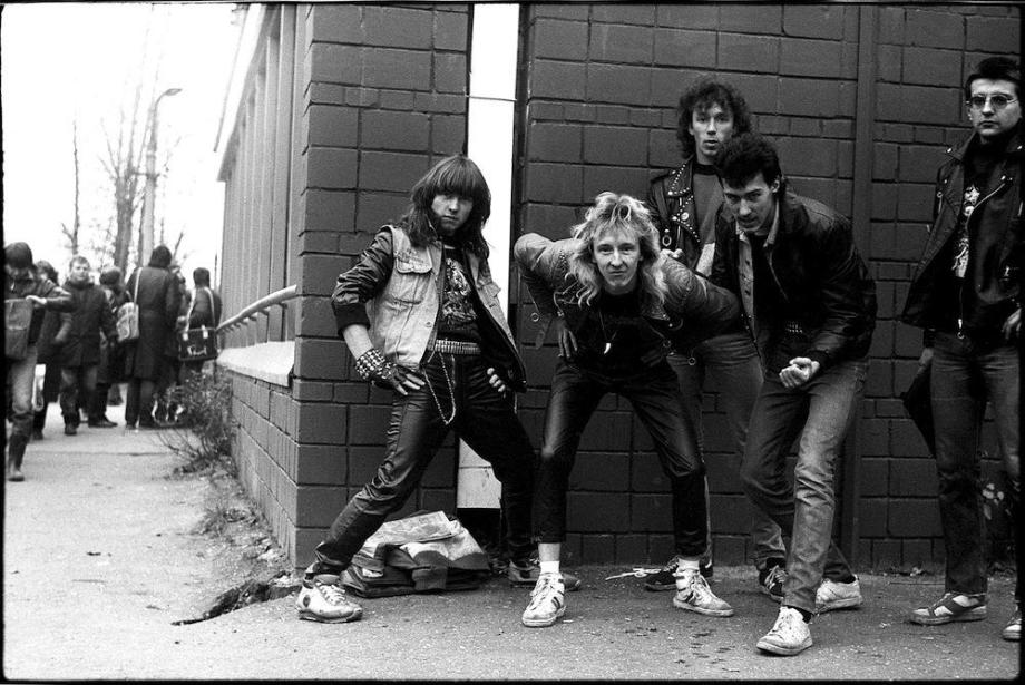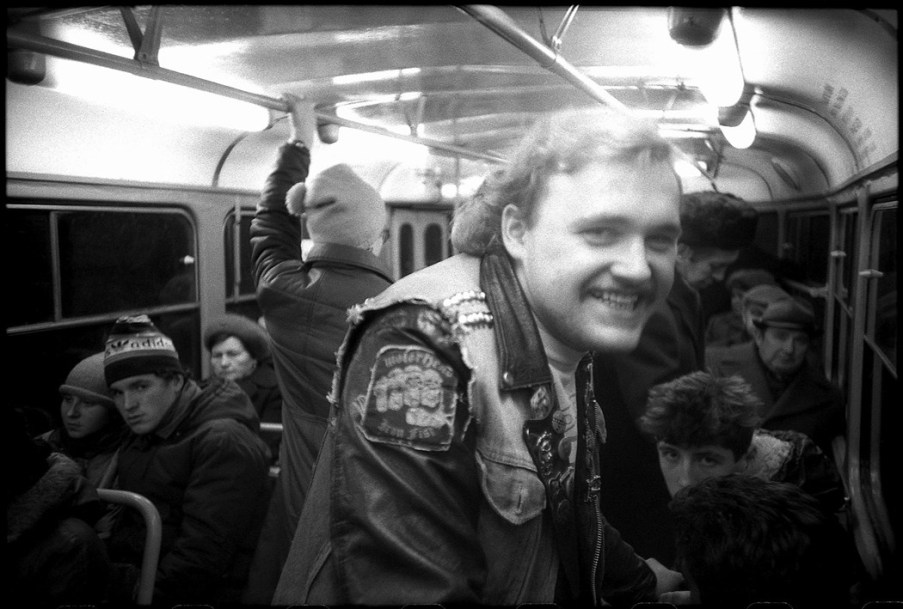 These photographs of feverish young men in jeans and leather jackets, more than anything else, are a splendid testament to the power and all-encompassing fluidity of art. They show how quickly can creative expression overcome differences of ideology, flow between areas of competing political interests. The pictures were published in the books Rock in Russland (1989) and Tusovka: Who’s Who in the New Soviet Rock Culture (1990) by Artemy Troitsky.