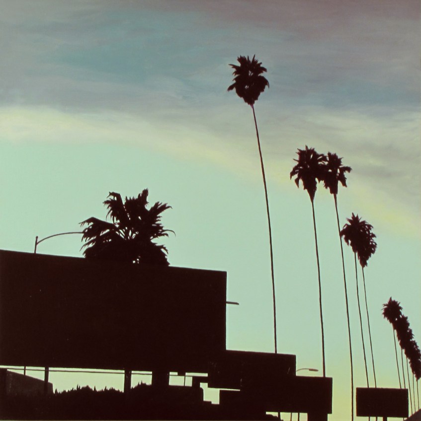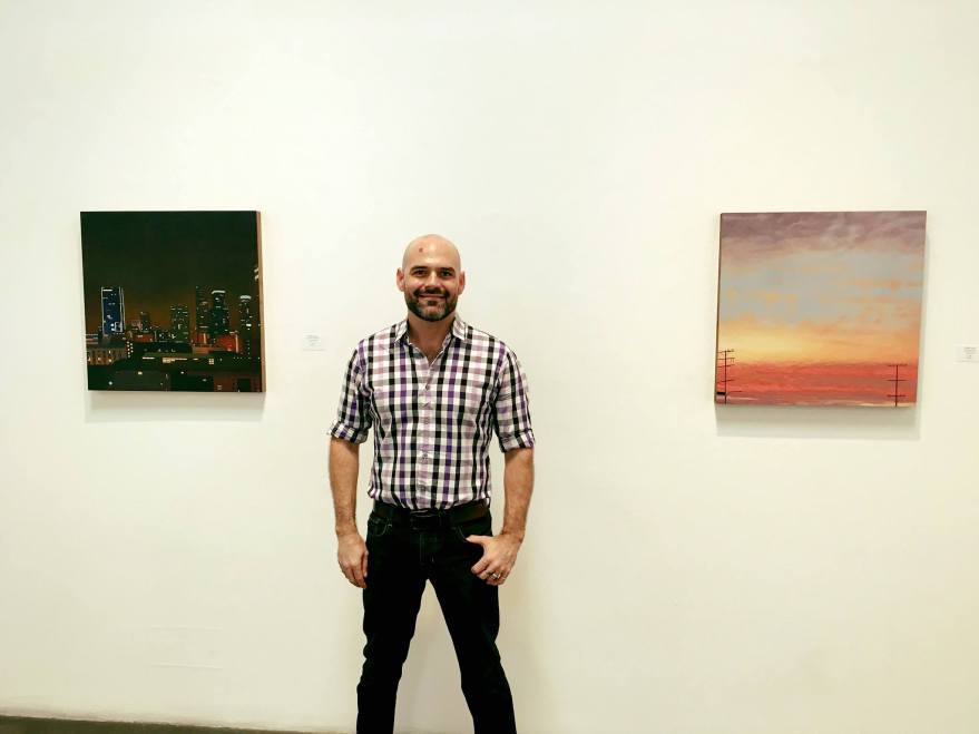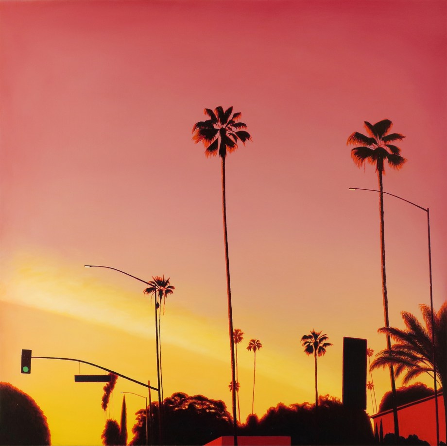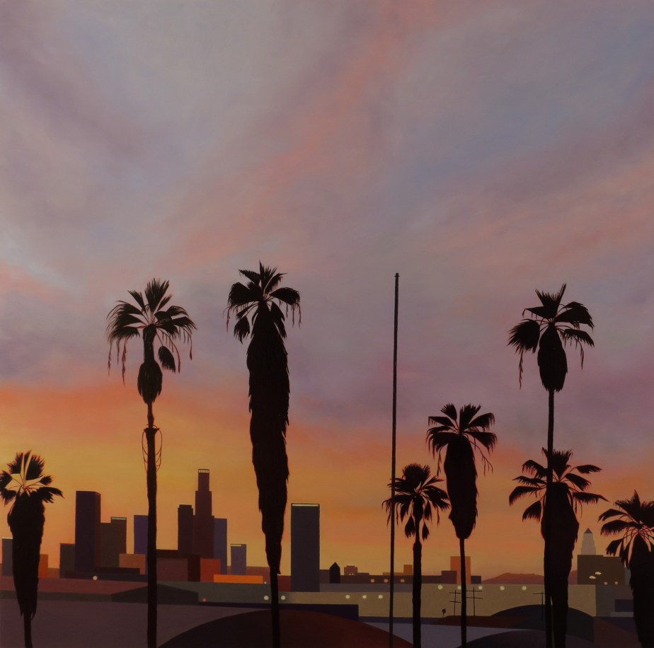 He explains his process of painting: “My paintings begin as photographs taken with my smartphone – my way of quickly referencing the beautiful moments I see every day. I review my many images to determine which ones will become paintings. The images that become paintings are often places I see regularly – the silhouette of palm trees from the freeway; the downtown skyline; the mountains and the ocean. Sometimes I see something so intensely gorgeous that I immediately know I have to paint it – the sunrise reflecting on the wing of a plane; the city lights from a downtown bar; a piece of plastic shining in the sun. My work references themes of nature and man.”