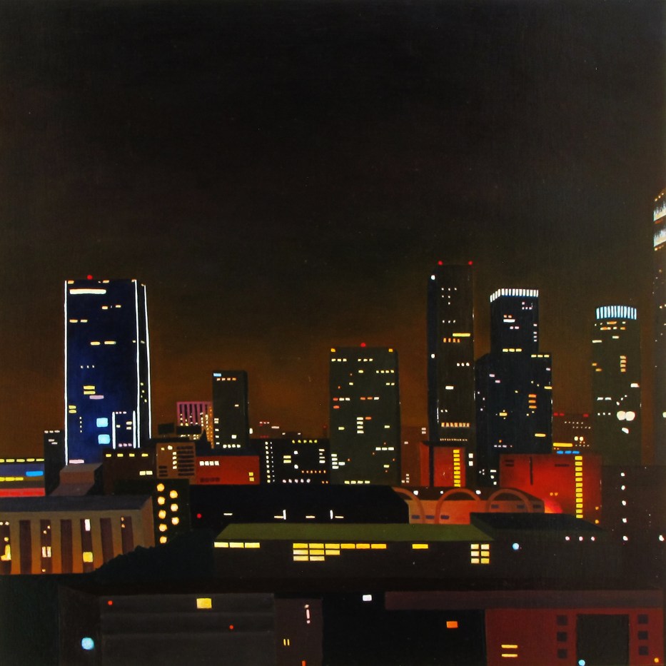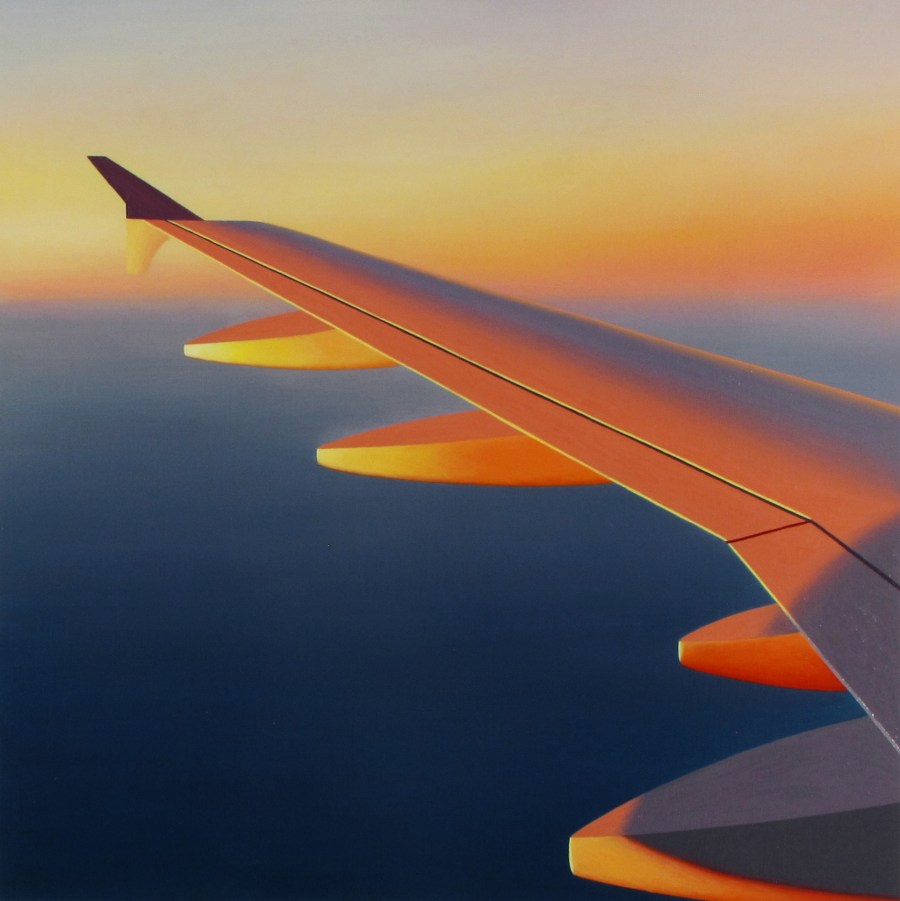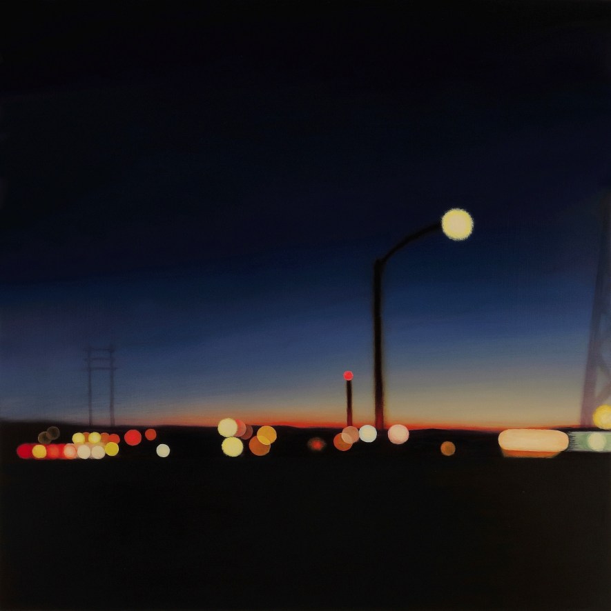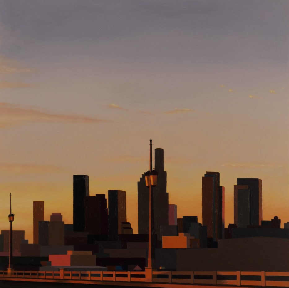 He explains his process of painting: “My paintings begin as photographs taken with my smartphone – my way of quickly referencing the beautiful moments I see every day. I review my many images to determine which ones will become paintings. The images that become paintings are often places I see regularly – the silhouette of palm trees from the freeway; the downtown skyline; the mountains and the ocean. Sometimes I see something so intensely gorgeous that I immediately know I have to paint it – the sunrise reflecting on the wing of a plane; the city lights from a downtown bar; a piece of plastic shining in the sun. My work references themes of nature and man.”