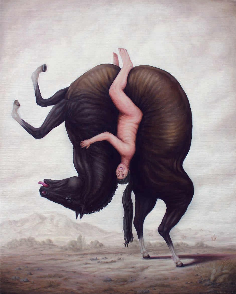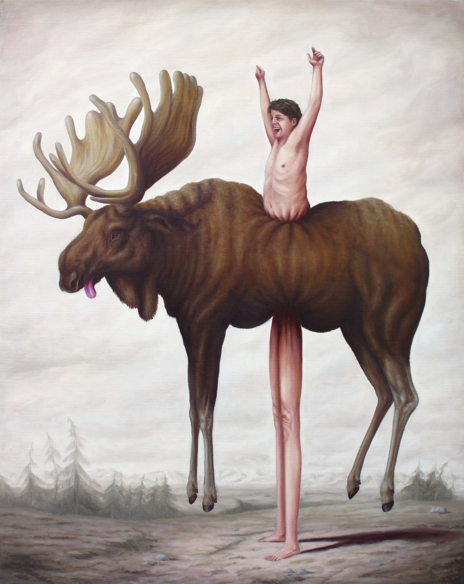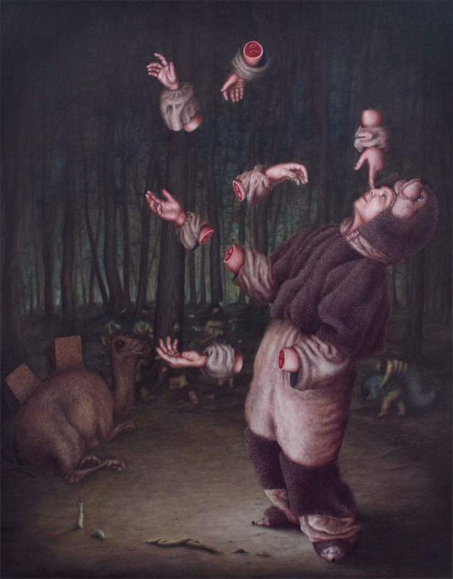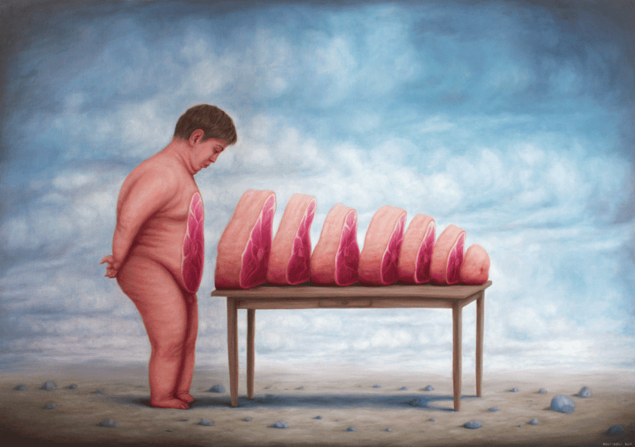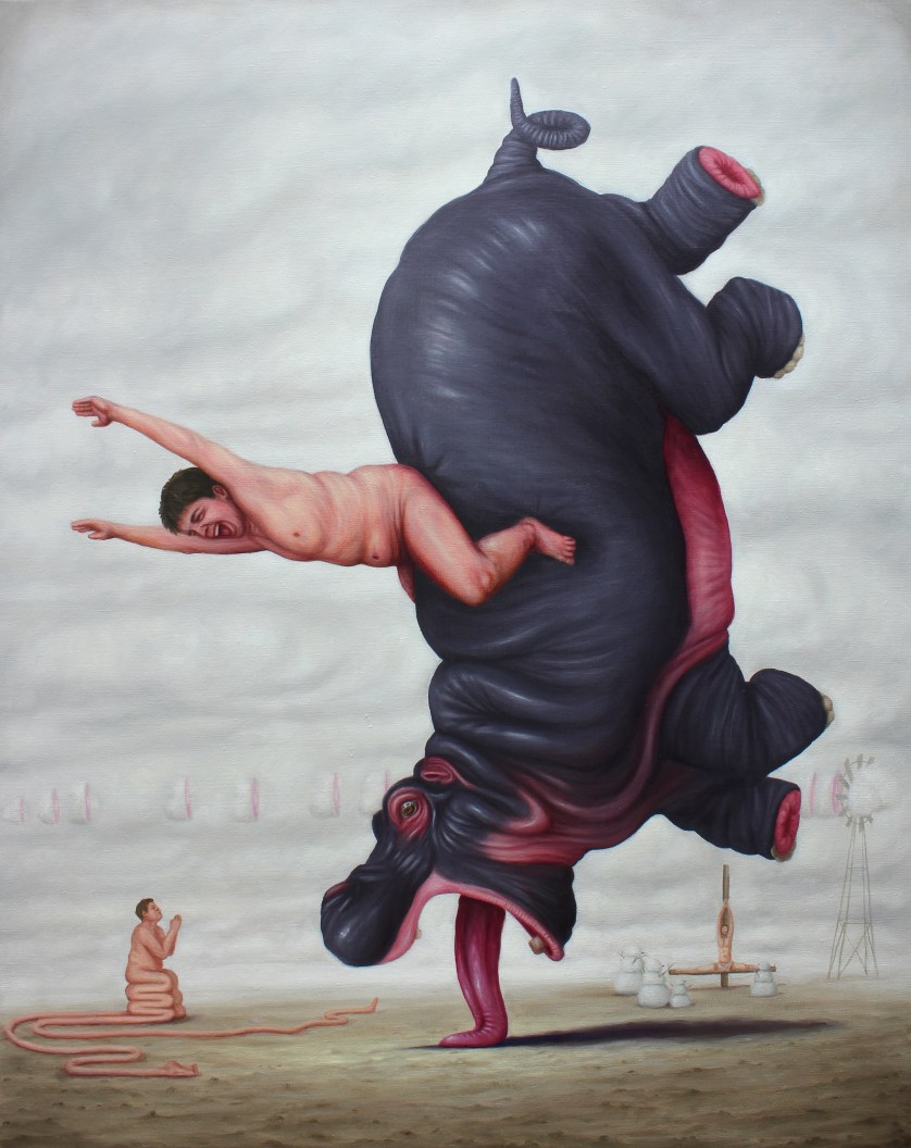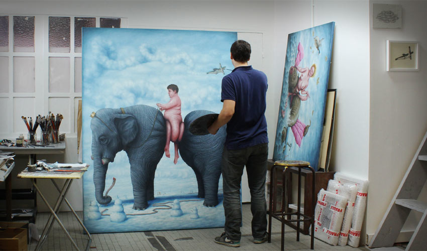 An admirer of René Magritte, Roland Topor, Rubens and Rembrandt, Bruno finds inspiration in situations, books and images that surround him. A simple photo of a camel can be the basis for a new painting. “Upon seeing my work for the first time,” he says, “people often refer to Surrealism and Dadaism. I wouldn’t want to categorise it. What I try to do is propose another version of reality, a different way of seeing things. When looking at my paintings, people seldom remain impassive, they either love or detest, find it funny or even macabre…and they usually share their opinion, discuss it. And to be honest that is what I like, what I am looking for.”