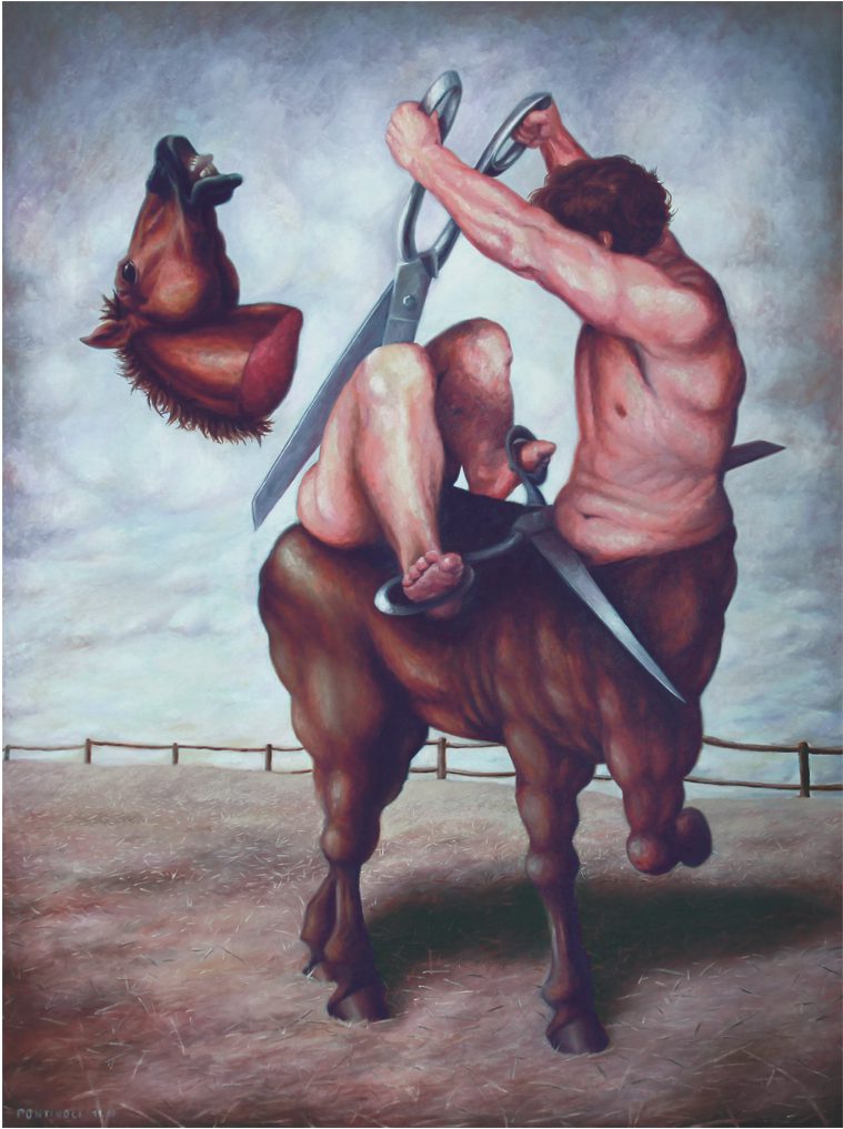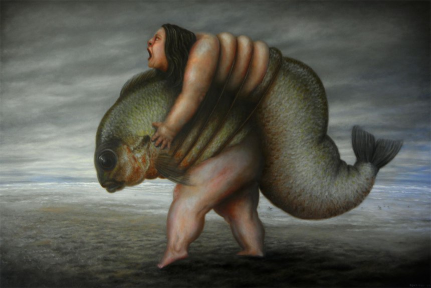 In Bruno’s fascinating and disturbing body of work, animal and human anatomy is stretched into long tubes and cut with scissors. Identities merge, a fish-woman “carries herself”. A man stares at his fatty stomach – spread out before him as chunks of flesh.