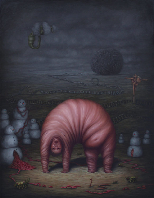 “Imagine a world based on a different logic; a universe comprised of the absurd and paradoxes. A dream in which aircraft crash into clouds and snowmen model a human body using flakes of skin,” writes French artist Bruno Pontiroli. “My aim is turn the narrow vision that we have of the world upside down and disturb our imagination while shaking an accepted reality with images that are as comprehensible as they are familiar. Distorting a symbol or mixing opposing universes allows me to question the identity of things so that I can reinvent them.”