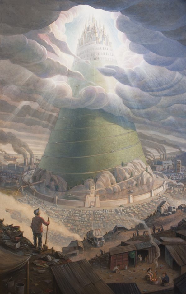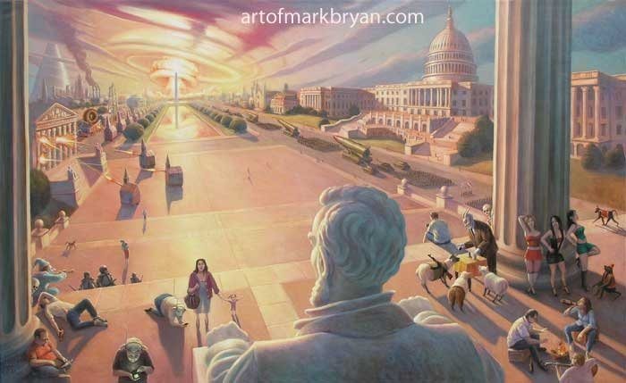 California-based artist Mark Bryan has painted colourful scenes of circus characters, alien spaceships, seascapes, landscapes, and hilarious visual takes on everyday phrases like “If Looks Could Kill” and “The Elephant in the Room”. But he is most famous for his satirical works on contemporary politics. These show dictatorial generals, the deteriorating environment, shining cities on hills erected at the expense of a poor working class, republics of highly distracted or heavily indoctrinated citizens, and, most recently, narcissistic presidents with hand mirrors…in baby diapers.