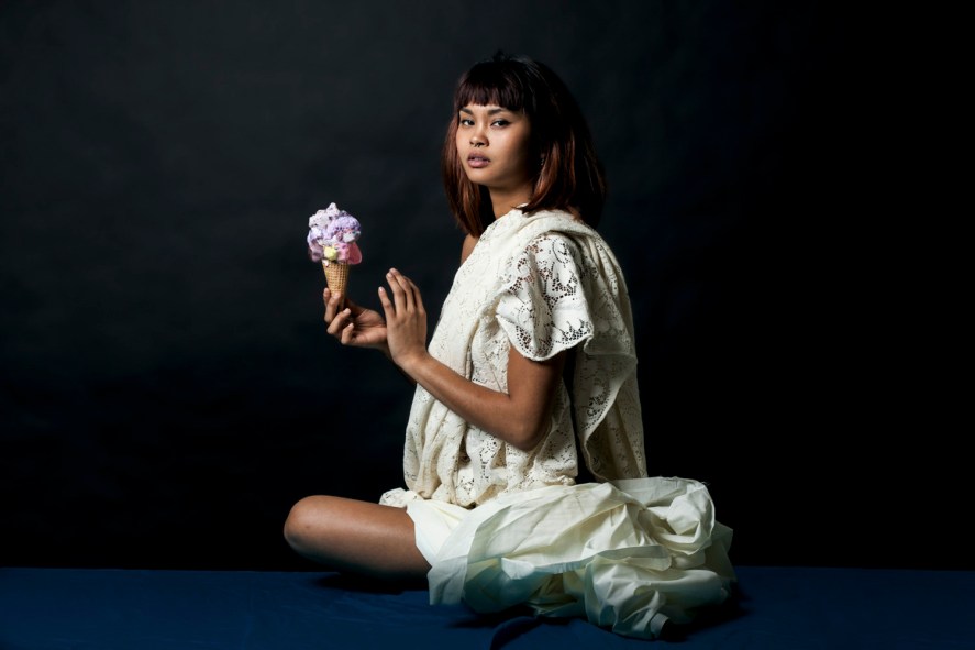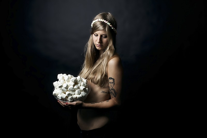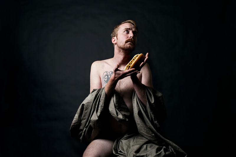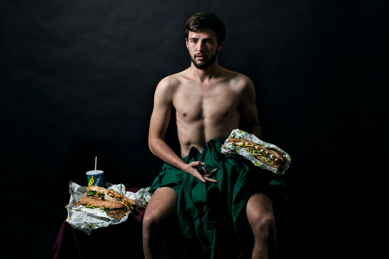 Rebecca asked her friends to model for her. “I like the fact that my friends in these photographs have tattoos and piercings,” she continues. “It underlines the concept that they are ‘Children of the Modern Age,’ having been brought up in the changing America, often defined by the culture of Fast Food. It was significant that many of my friends try to avoid Fast Food. In their eyes, Fast Food in the United States is comprised of genetically modified items that are designed only for mass consumption. To them, the food becomes a non-edible object and loses its value as being considered Food.”