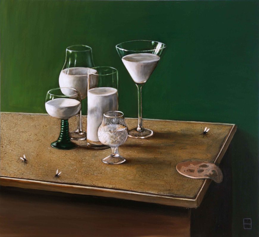 Symbols of death, decay and decadence – flies, skeletons, liquor, meat – co-exist with bunnies, teddy bears and other hybrid creatures, stuff out of children’s stories. This juxtaposition results in a strange dark imagery that often tries to reconcile opposite phenomenon, for instance, pleasure and pain. The absurd melange both irritates and amuses. It is “something between disgusting, pitiable and a little funny”, the artist asserts.