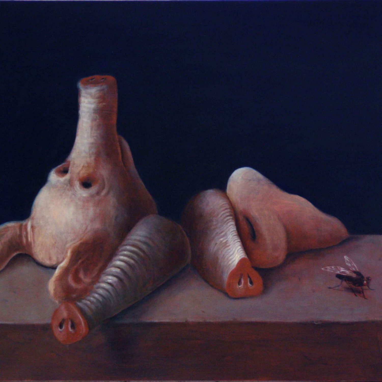 Symbols of death, decay and decadence – flies, skeletons, liquor, meat – co-exist with bunnies, teddy bears and other hybrid creatures, stuff out of children’s stories. This juxtaposition results in a strange dark imagery that often tries to reconcile opposite phenomenon, for instance, pleasure and pain. The absurd melange both irritates and amuses. It is “something between disgusting, pitiable and a little funny”, the artist asserts.
